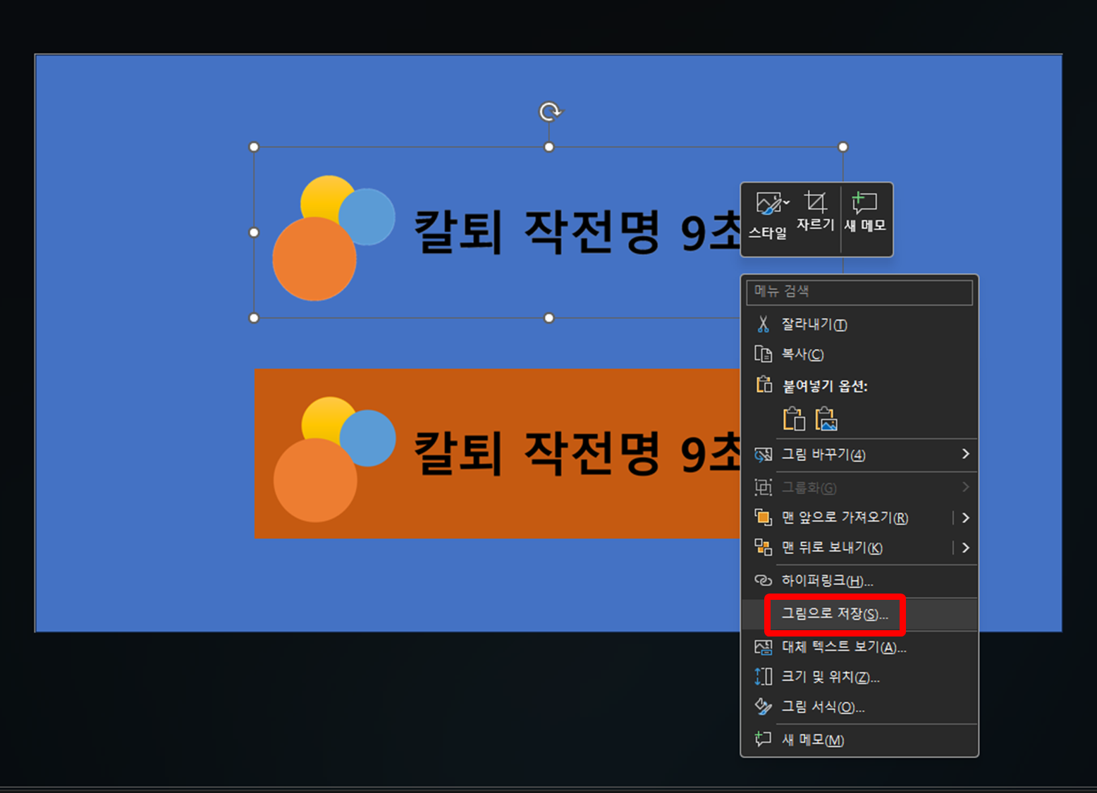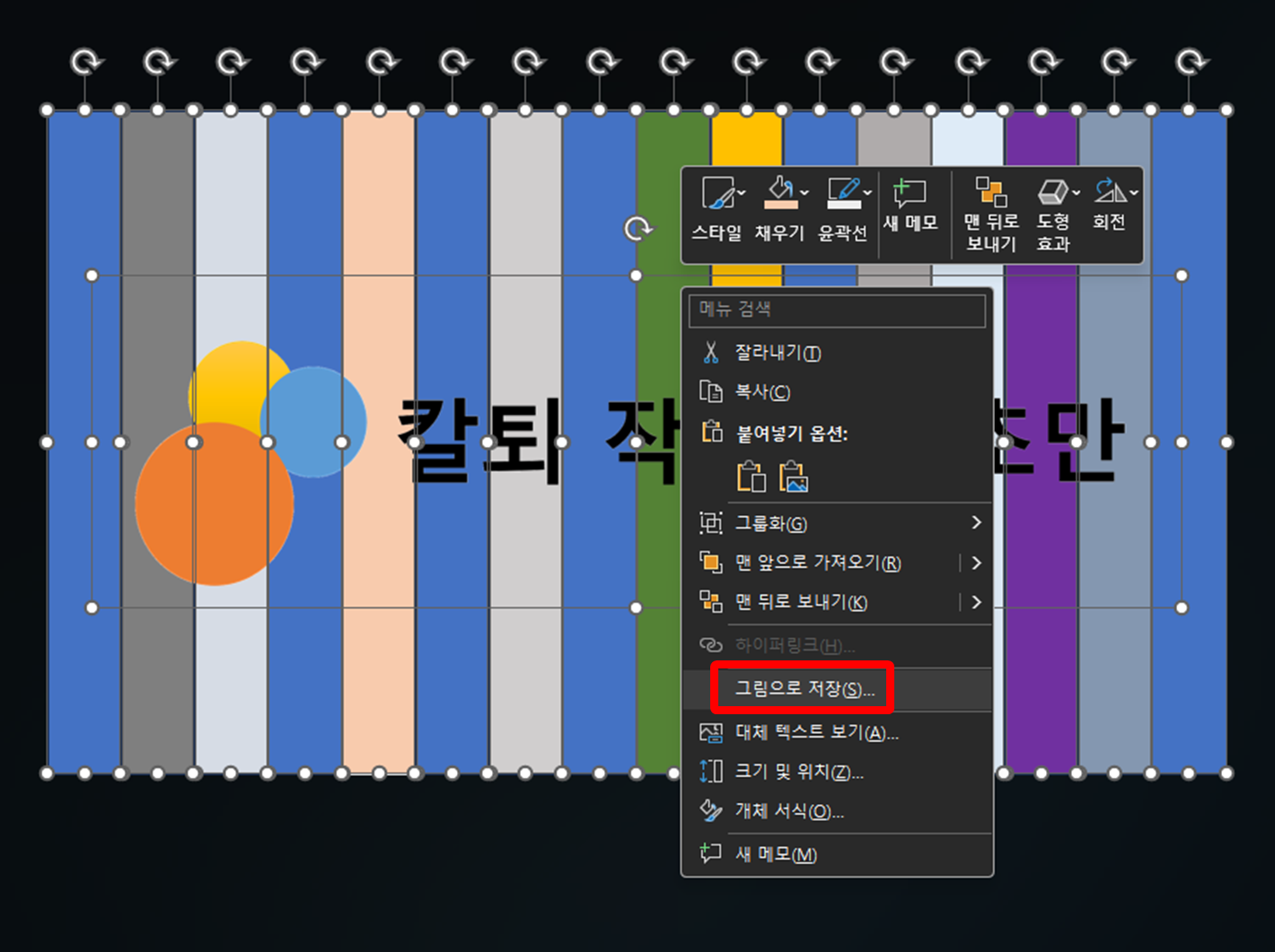 PPT에서 작업을 했기에 그림으로 저장을 해 봅니다. 마우스 우클릭을 하고 그림으로 저장을 선택합니다. 파일 형식은 이동식 네트워크 그래픽으로 하시면 됩니다.