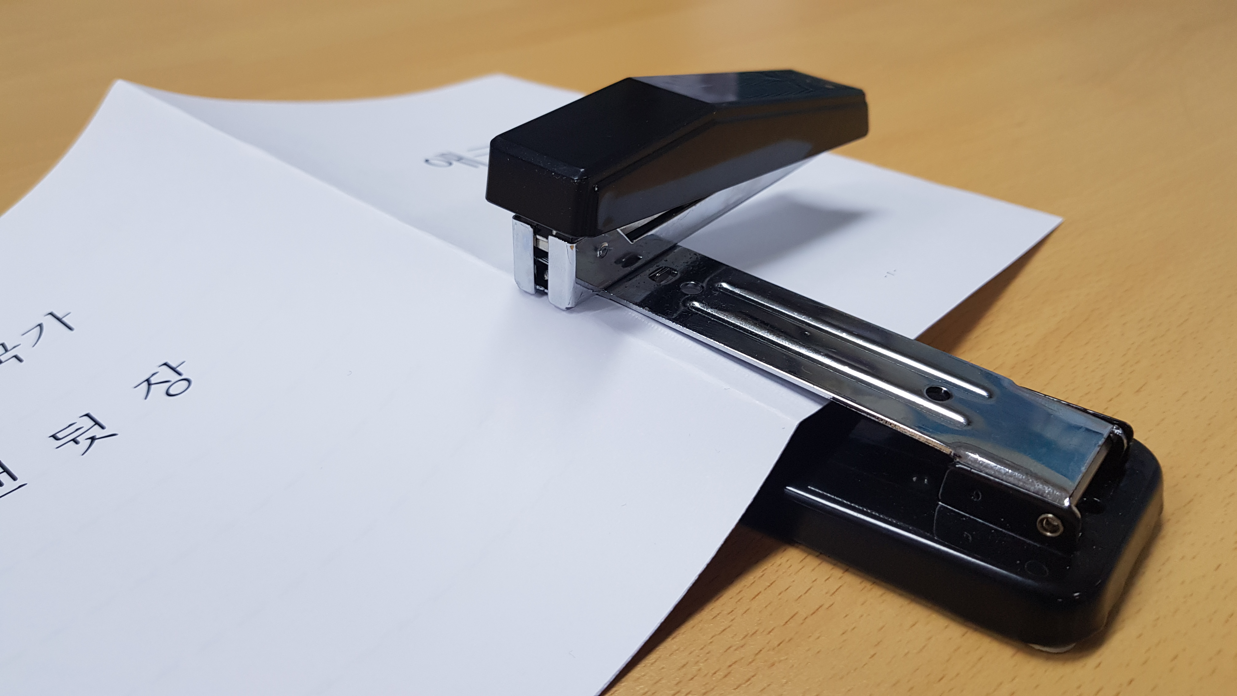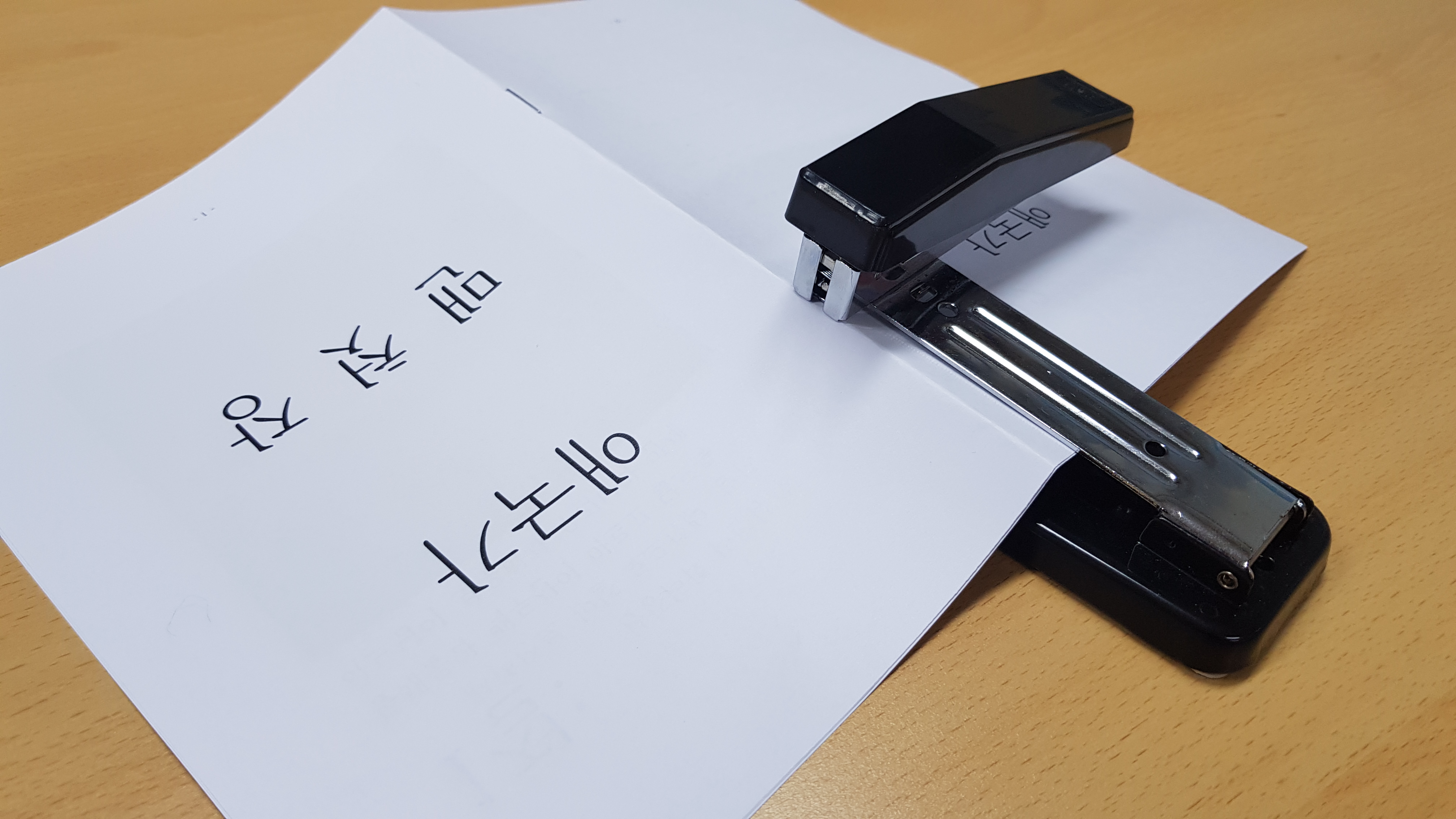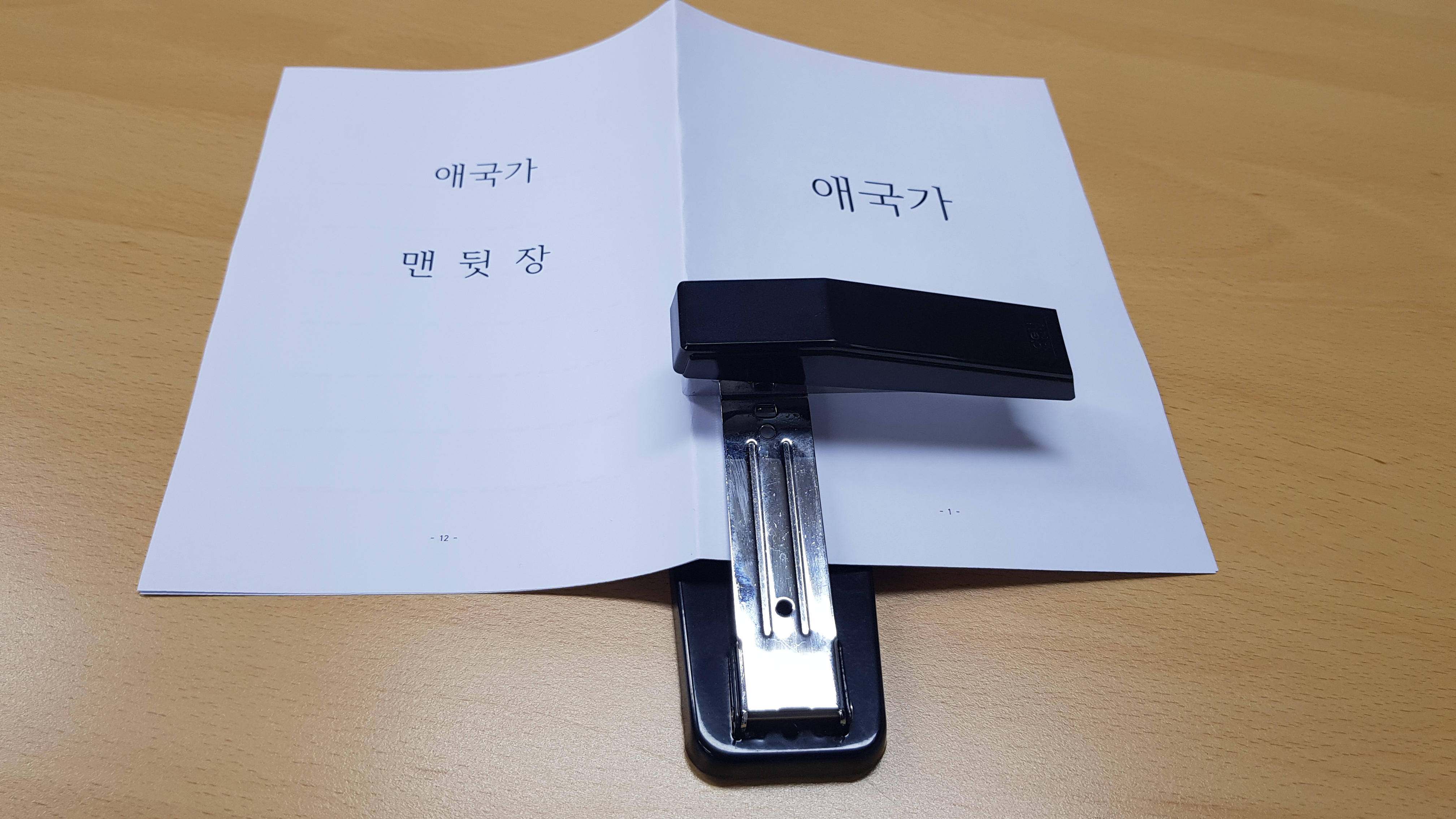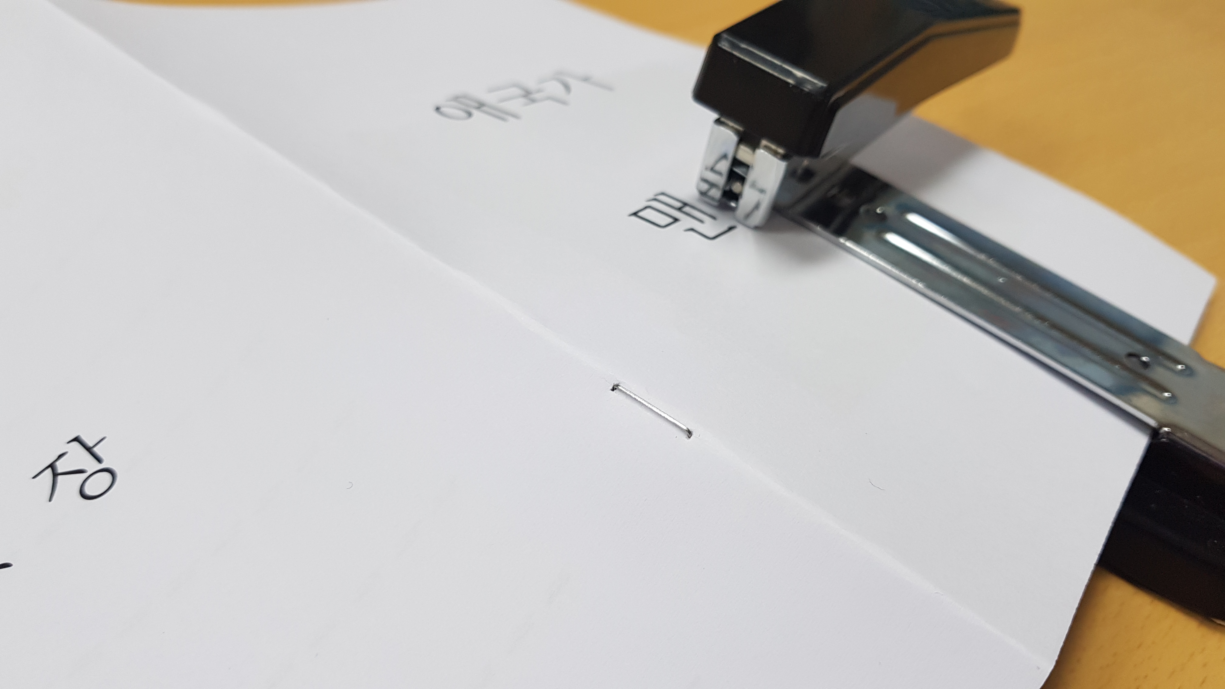 가운데 접힌 선을 따라 스테이플러로 찍어주시면 됩니다. 지금 보시는 스테이플러는 롱암 스테이플러는 아니지만 중철 제본 겸용으로 나온 거라서 많지 않은 페이지는 잘 찍히는 것 같습니다.