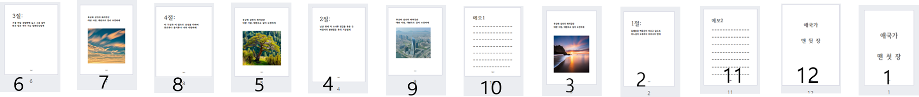 왜냐면 애국가의 전체 페이자가 12페이지이기 때문에 페이지를 재배열하여 제일 처음 오는 페이지가 12페이지의 절반인 6페이지가 되어야 하기 때문이죠.
