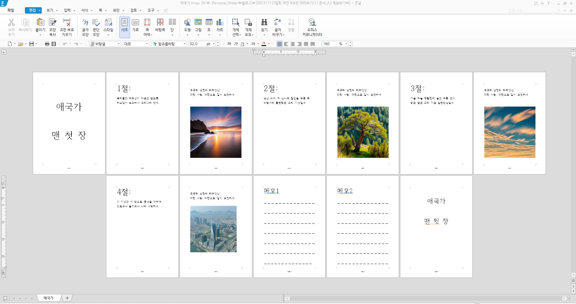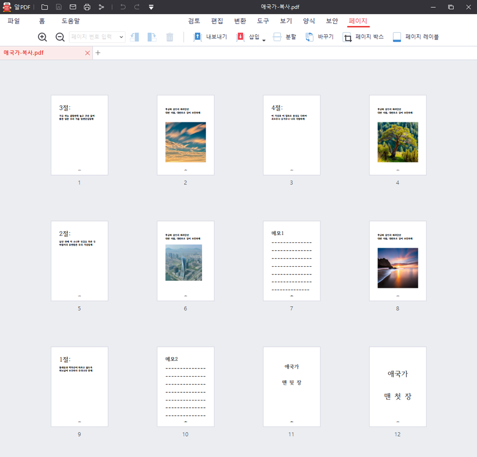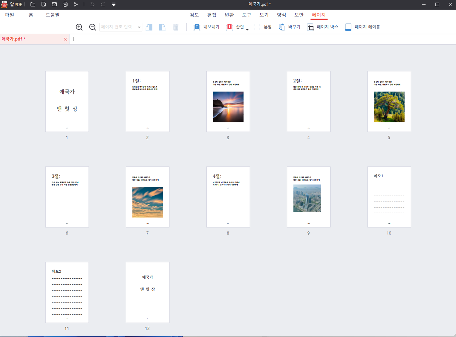 한글로 12페이지 문서를 작성했습니다. 애국가이고요, 애국가 맨 첫 장 부터 애국가 맨 뒷 장까지 순서대로 작성했는데요, 총 12페이지 문서입니다.