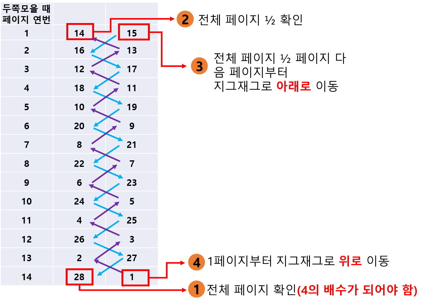 아래 그림은 한 페이지를 가로로 두쪽모아 인쇄할 때 한 페이지에 들어갈 페이지들입니다. 아래 표를 예로 들자면 총 28페이지(14장)로 구성되어 있는 것이지요.