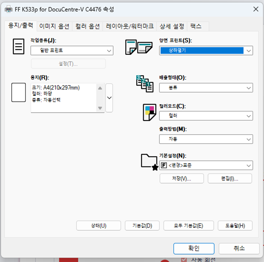 [추가설정] ← 오른쪽(왼쪽 인쇄 설정에서 흑백 인쇄 바로 오른쪽 확장 빨간 원을 클릭하면 나옵니다.)
