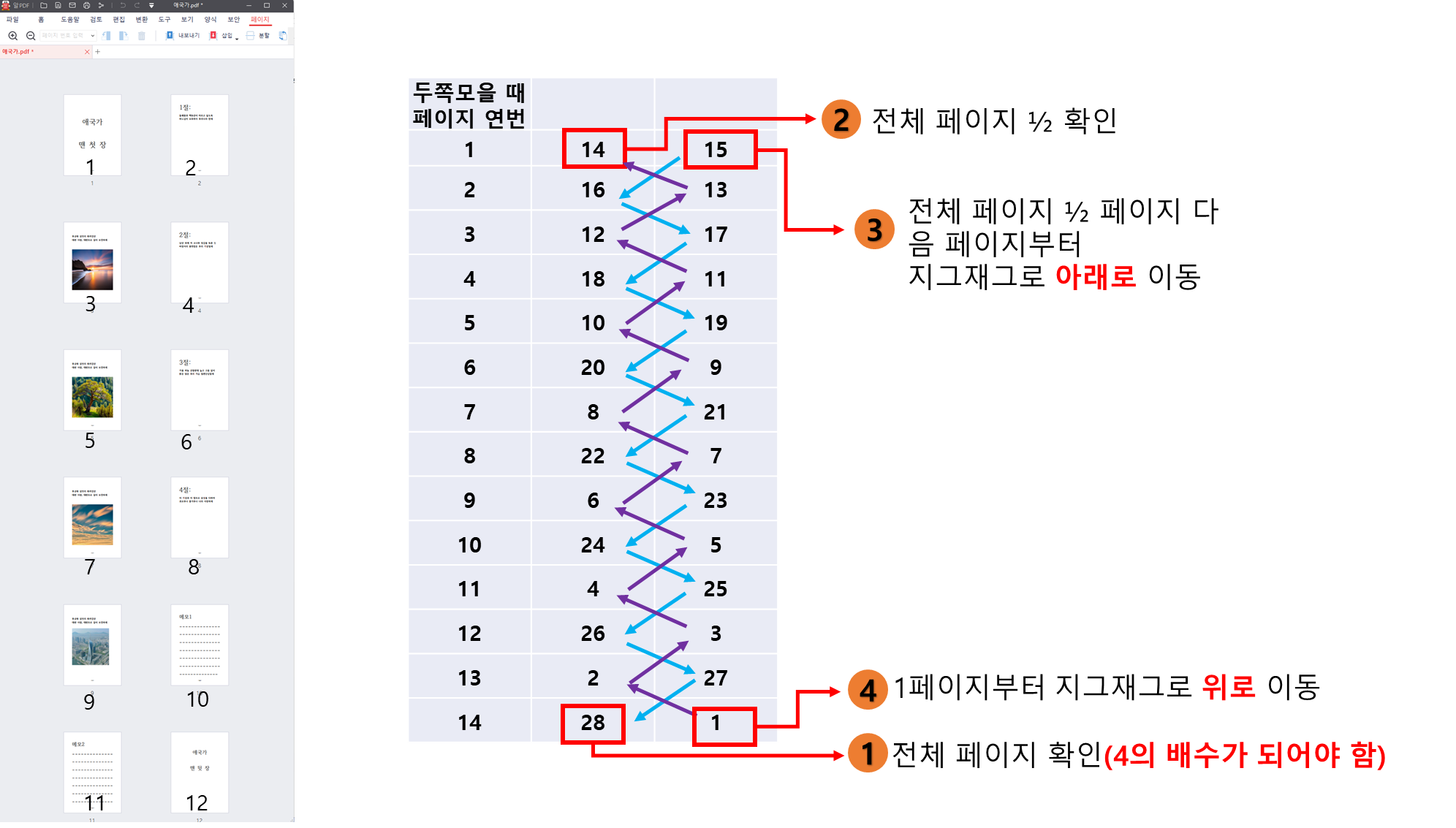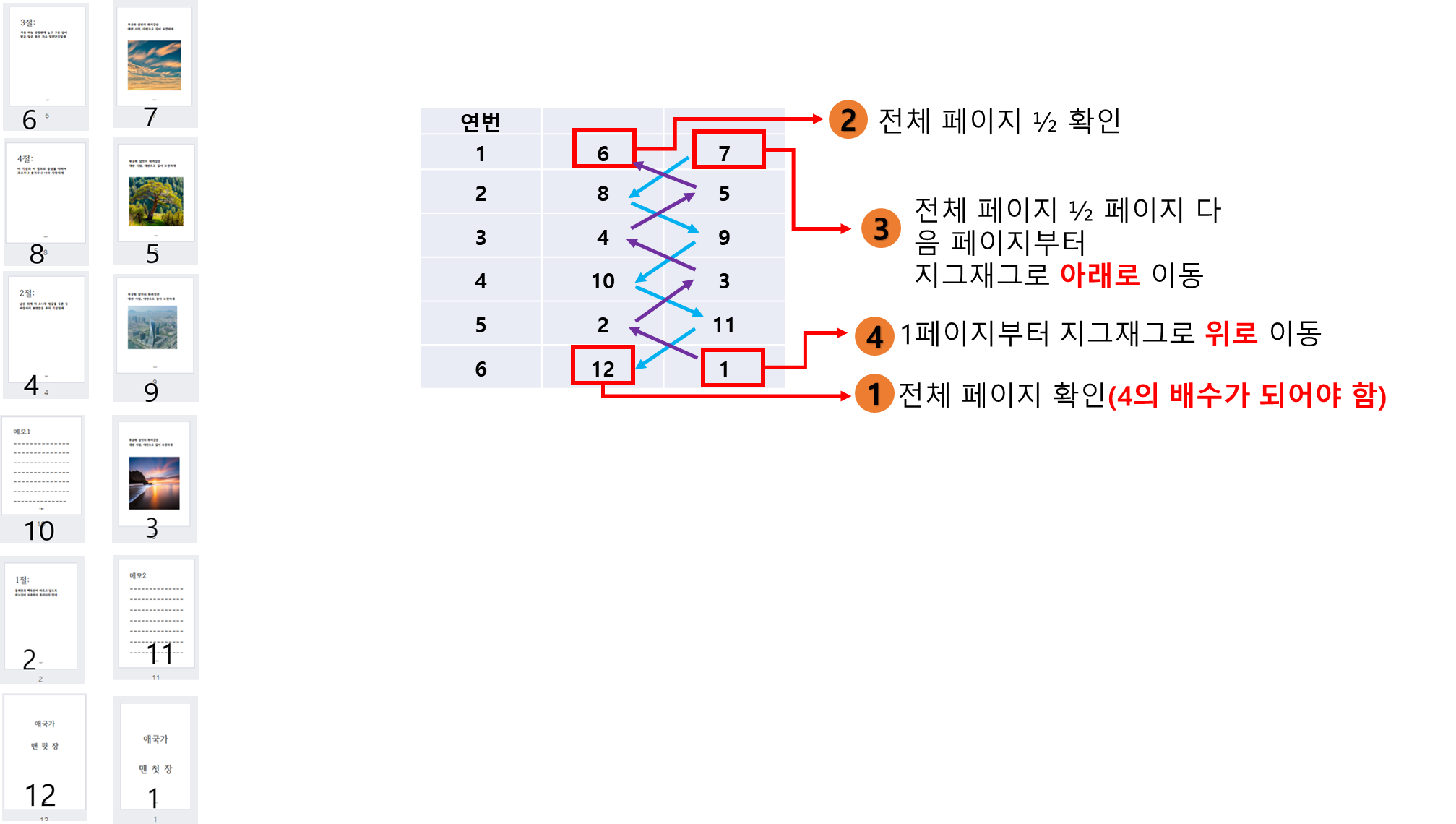 이제 페이지 재배열을 할 텐데요, 아까 살펴봤던 페이지 배열표와 비교해 보겠습니다.