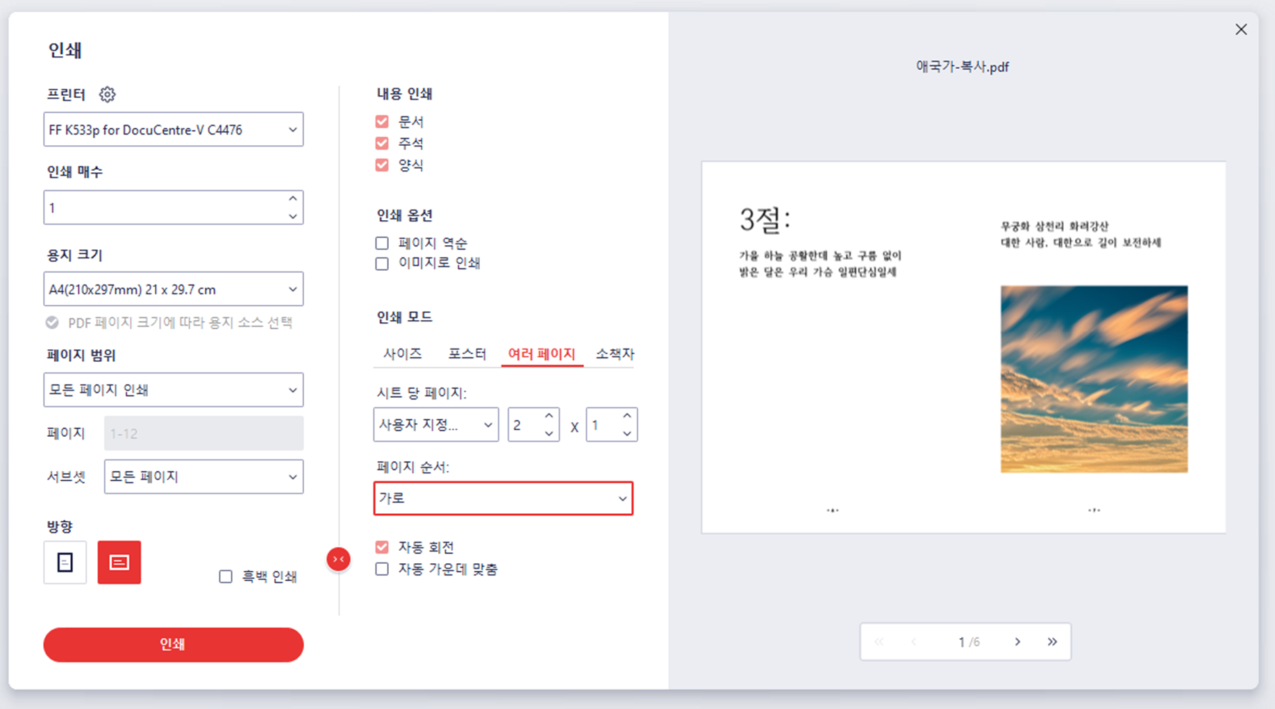 자 그러면 인쇄 결과가 어떻게 되었을까요? 애국가 맨 첫 장과 애국가 맨 뒷장이 맨 마지막 면에 인쇄되어 있을 겁니다.