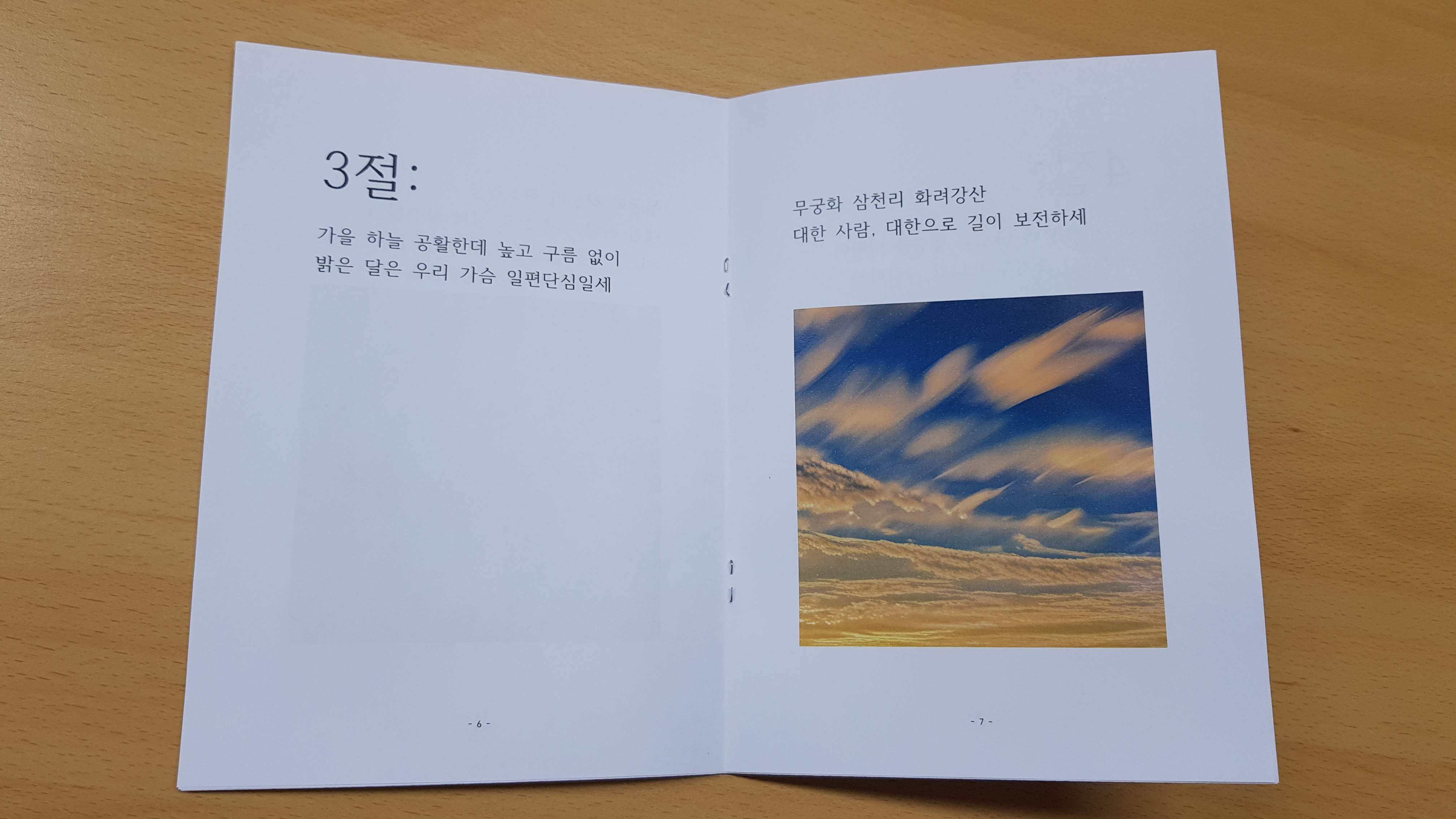지금 보여드리는 것은 간단한 브로셔나 소책자 정도의 의미로 봐주시면 감사하겠습니다. 대략적인 프로세스는 다음과 같고요, 오늘 예시는 애국가가 되겠습니다.