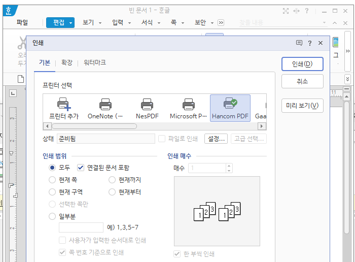 위 그림을 보니 Hancom PDF가 있네요. 아마 다들 여러 PDF 프로그램이 설치되어 있을 텐데요, PDF로 변환하는 것은 아무것이나 상관은 없는 것 같습니다. 물론 간혹 가다가 특정 PDF 프로그램에서 인쇄가 안 된다던가 하는 문제들은 있는 것 같더라고요. 그런데 그것은 오늘의 논점이 아니니 패스하겠습니다.
