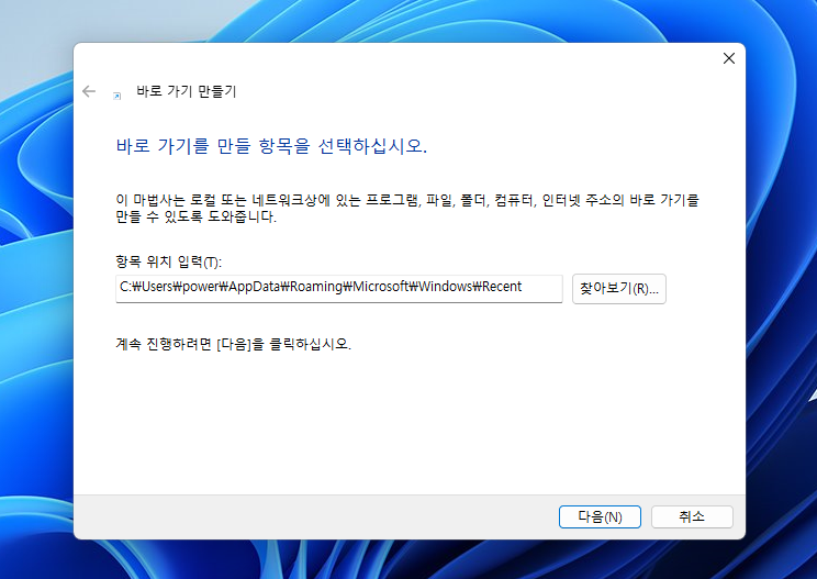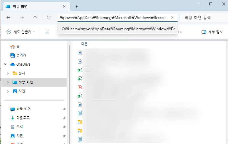 예를 들어, 계정 이름이 minji라면 아래처럼 변경해야 합니다. C:\Users\minji\AppData\Roaming\Microsoft\Windows\Recent
