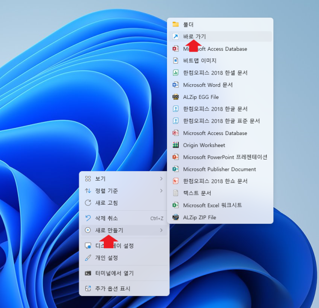 1. 바탕화면에서 마우스 우클릭 > 새로 만들기 > 바로 가기
