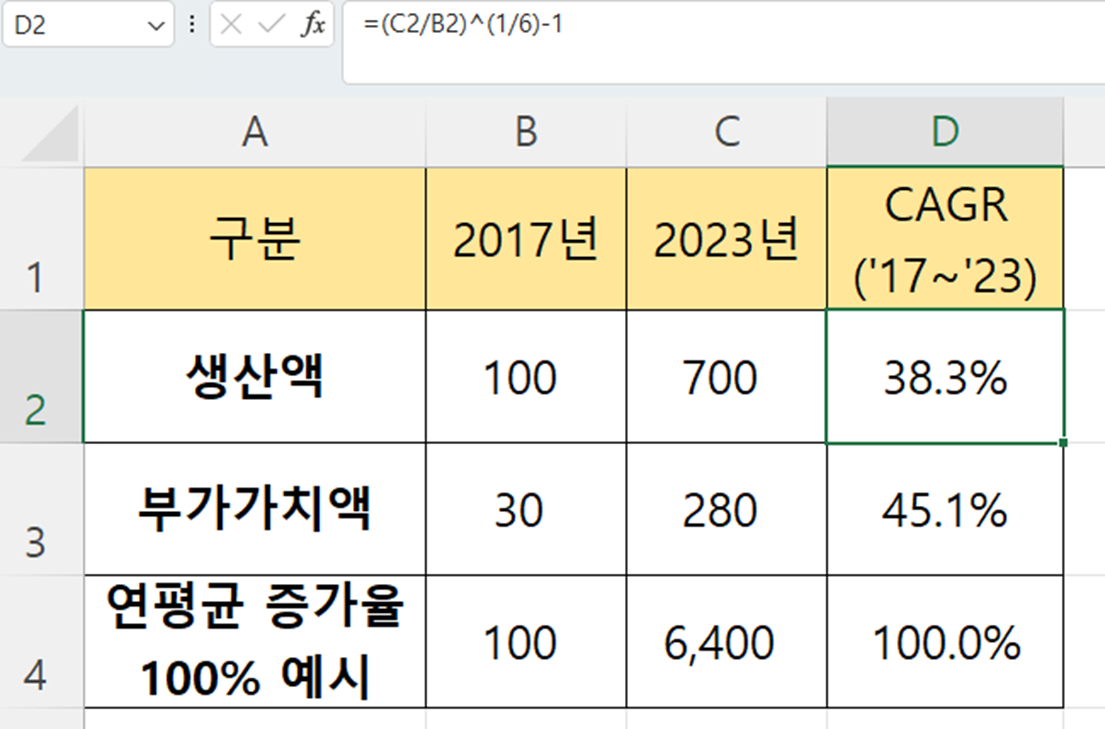 위에처럼 2017년과 2023년 값만 있어도 연평균 증가율을 구할 수 있습니다.