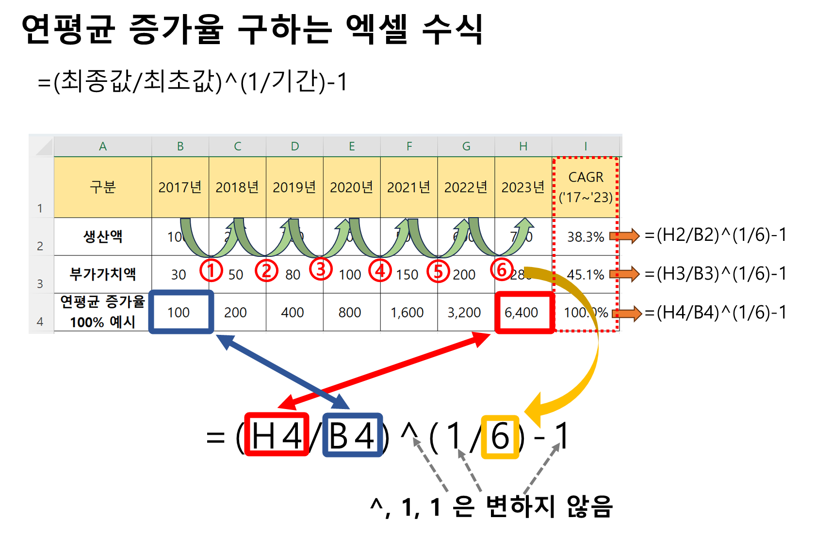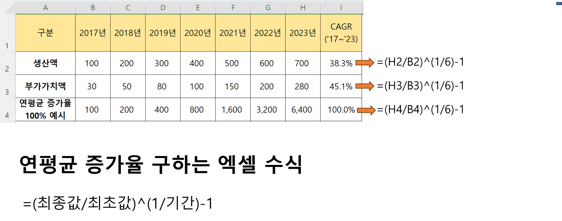 위에처럼 2017년과 2023년 값만 있어도 연평균 증가율을 구할 수 있습니다.