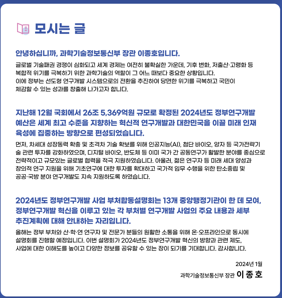 안녕하세요! 오늘은 지난 주에 열린 2024 정부 R&D 사업 부처합동 설명회를 갈무리해 보려고 해요. 이번 설명회는 정부의 R&D 사업에 대한 정보를 제공하고, 연구자들의 참여를 유도하기 위해 개최되었는데요, 설명회는 과학기술정보통신부, 산업통상자원부, 중소벤처기업부 등 여러 부처가 참여하여 다양한 분야의 R&D 사업에 대한 정보를 제공하였습니다.
