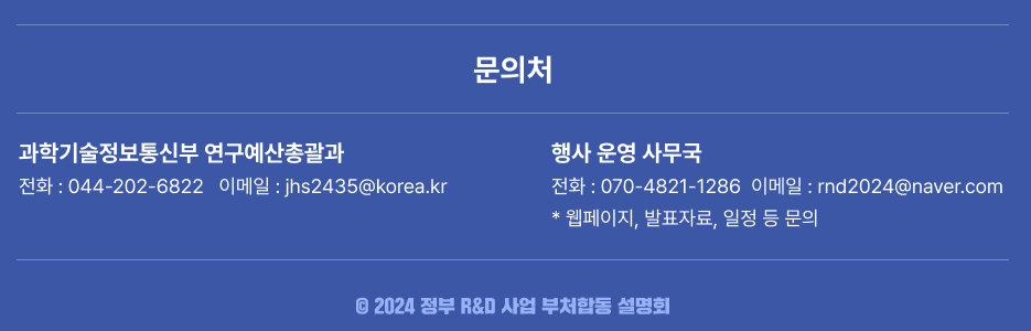 2024 정부R&D사업 부처합동설명회 웹사이트에 게시된 내용을 캡처한 것입니다. 지난 정보라 크게 유용하지는 않을 듯 싶지만 참고하실 수 있도록 게시하였습니다.