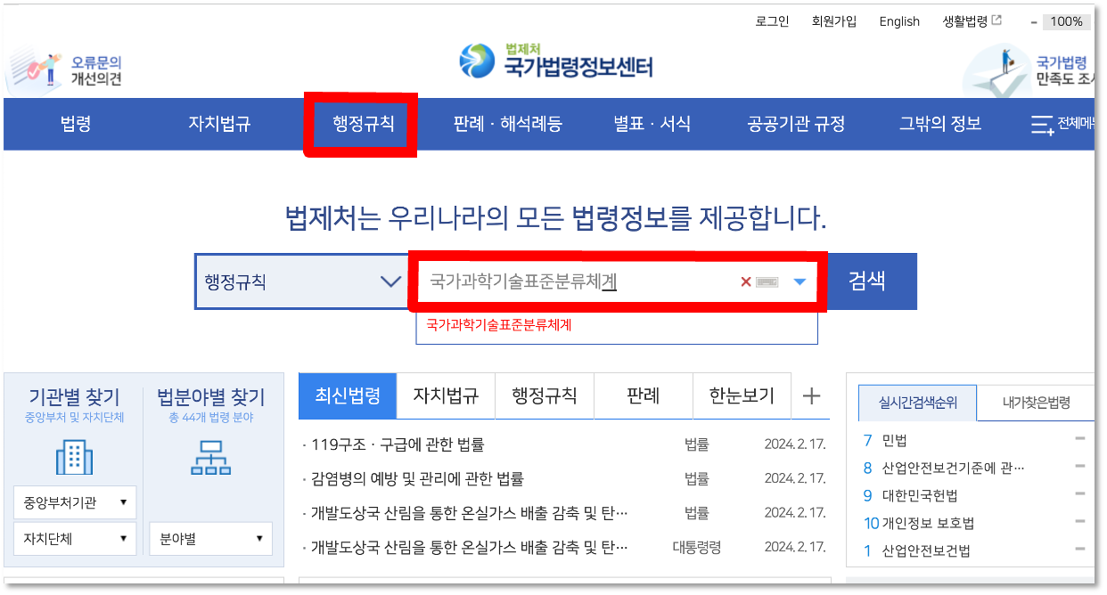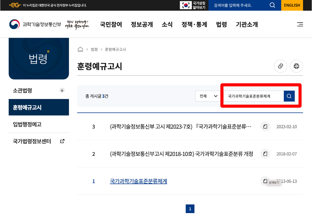 위 국가법령정보센터에 접속하여 행정규칙을 선택한 후 '국가과학기술표준분류체계'를 검색하시면 됩니다.
