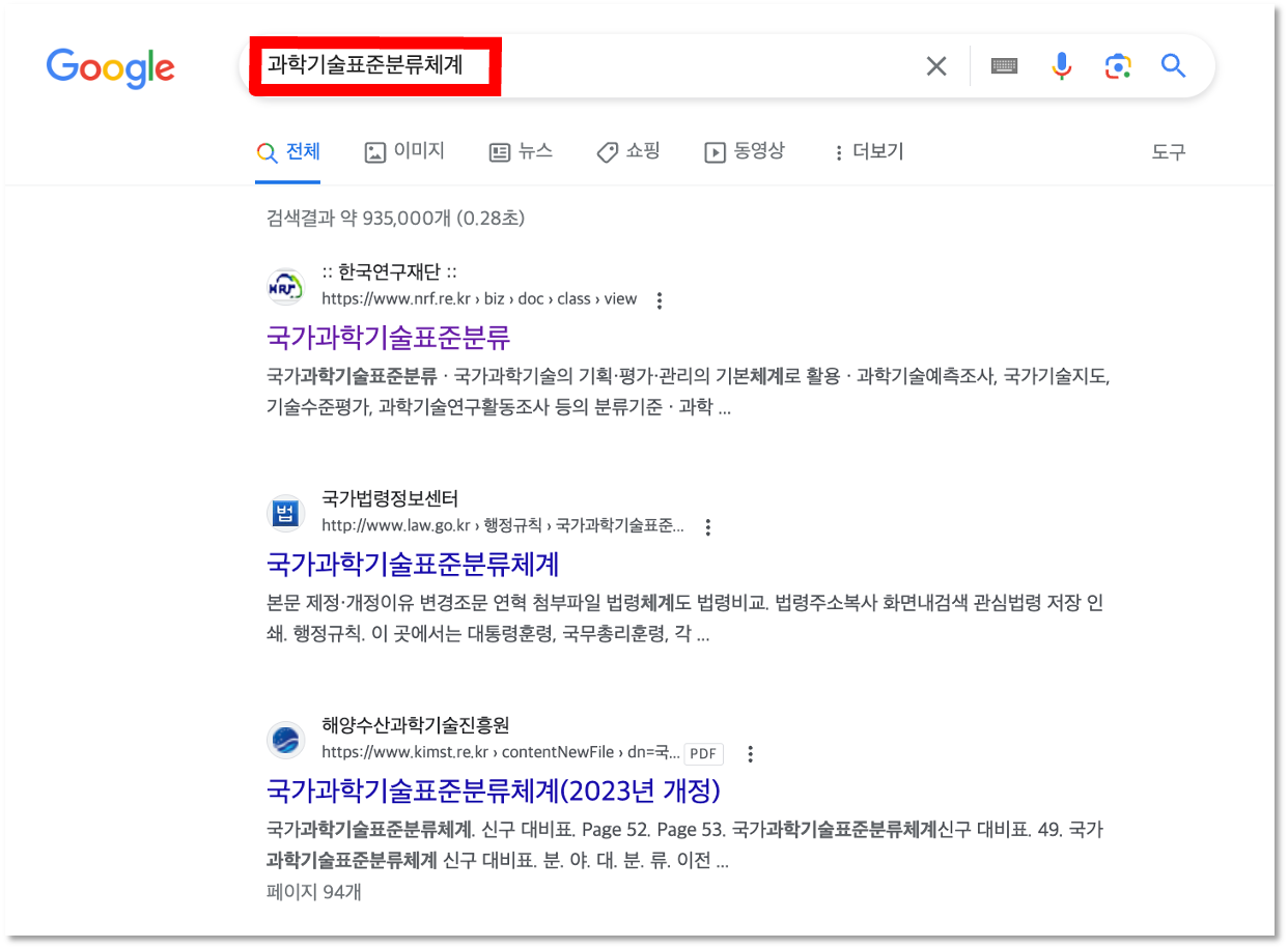 세 번째 방법으로는 웹브라우저에서 '과학기술표준분류체계'를 검색하는 방법입니다. 한국연구재단을 비롯하여 여러 지자체나 기관에서 게시한 것을 참고하시면 됩니다.