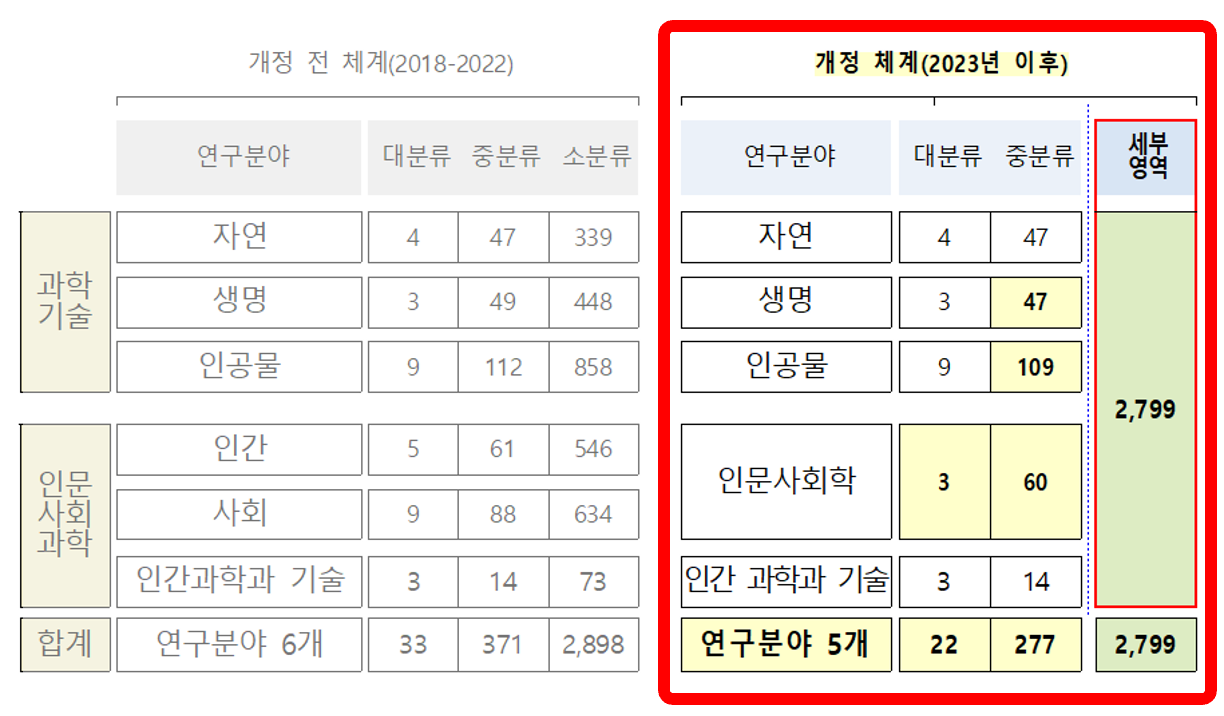 연구분야는 3 계층 분류체계로서 2023년 개정 이후 22개 대분류와 하위 277개 중분류 및 2,799개 소분류로 구성되며, 적용분야는 1 계층 분류체계로서 33개의 대분류로 구성되었습니다.