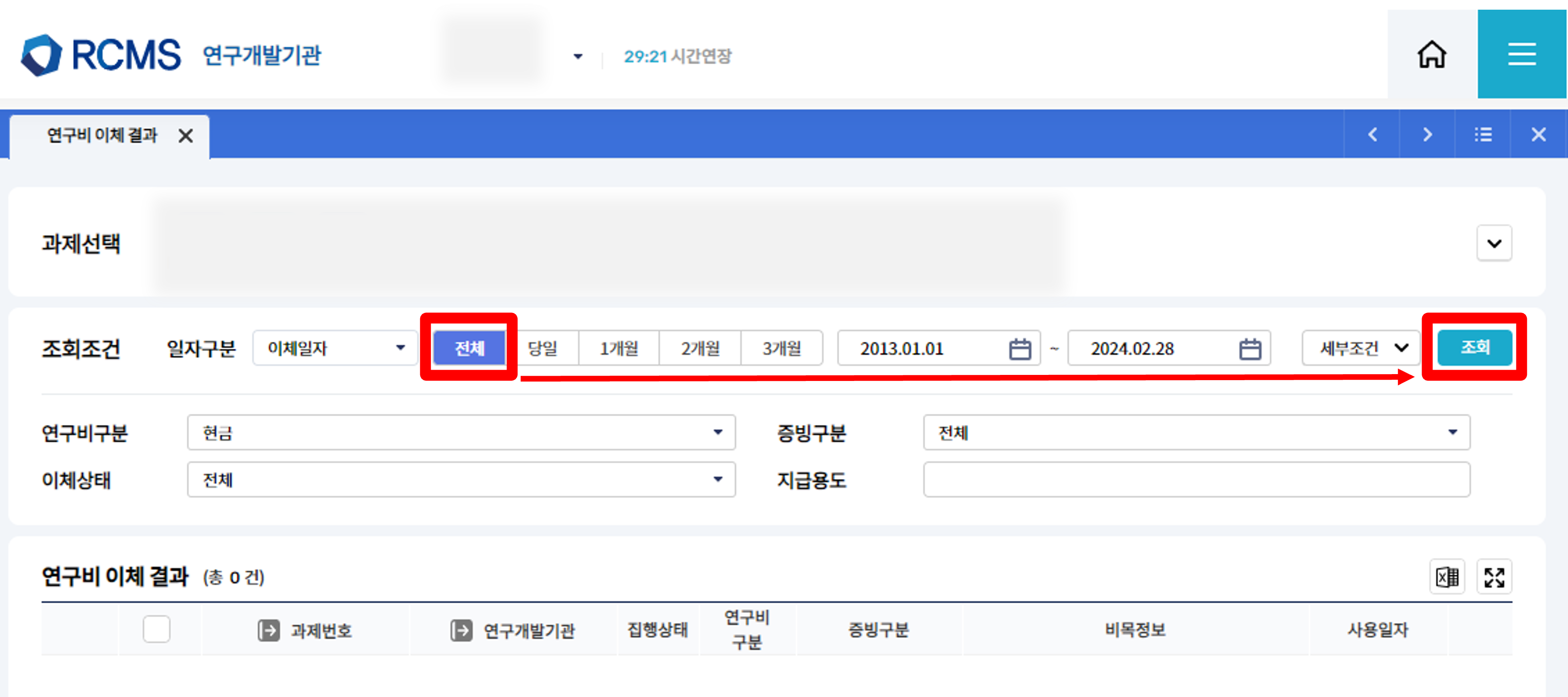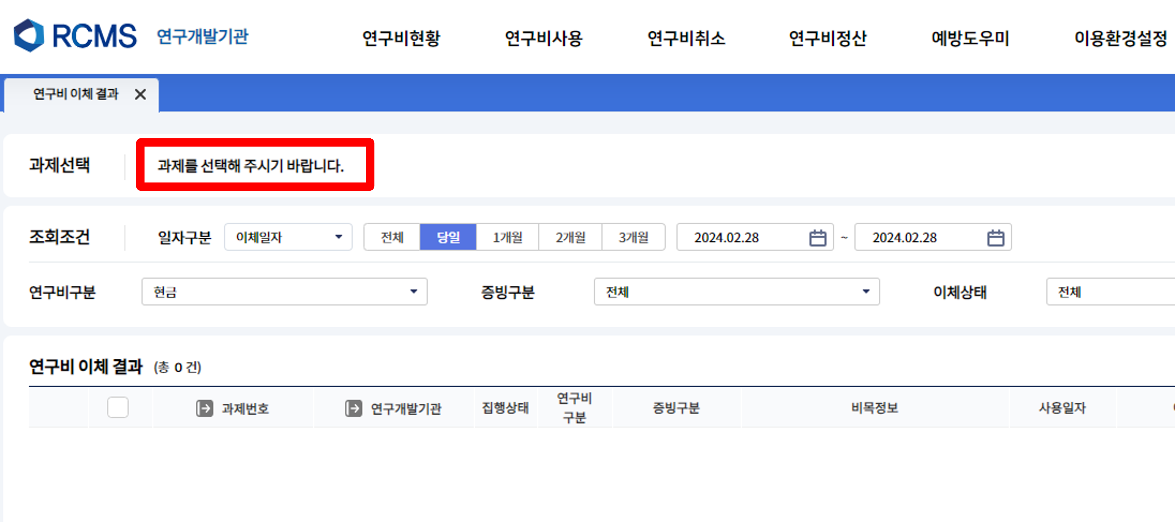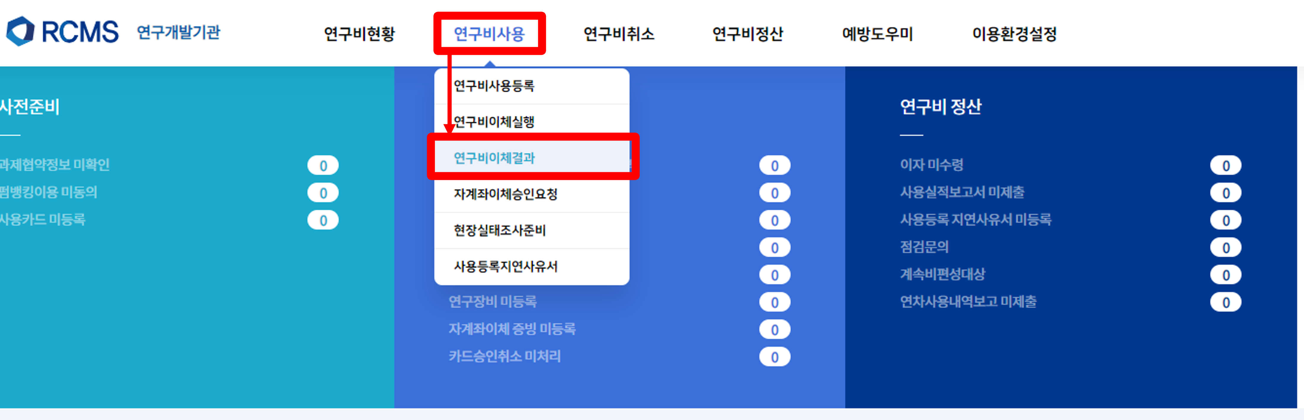 상단 전체 메뉴에서 연구비사용 클릭 후 연구비이체결과를 클릭합니다.