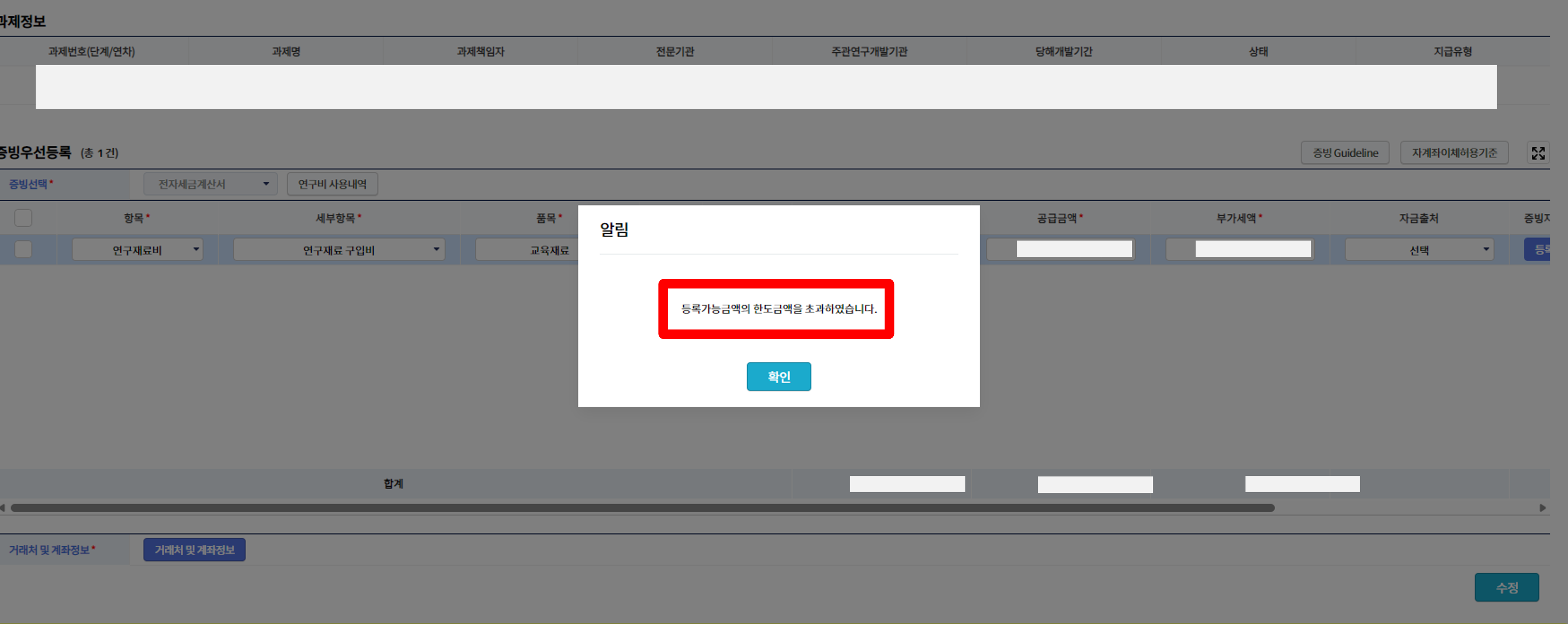 ※ 그런데 아래처럼 "등록가능금액의 한도금액을 초과하였습니다."라는 메시지가 나오면 단순히 RCMS 상에서 내역을 수정하는 것으로 끝나지 않고 별도의 예산변경 등의 작업을 거쳐야 하는 것 같습니다.