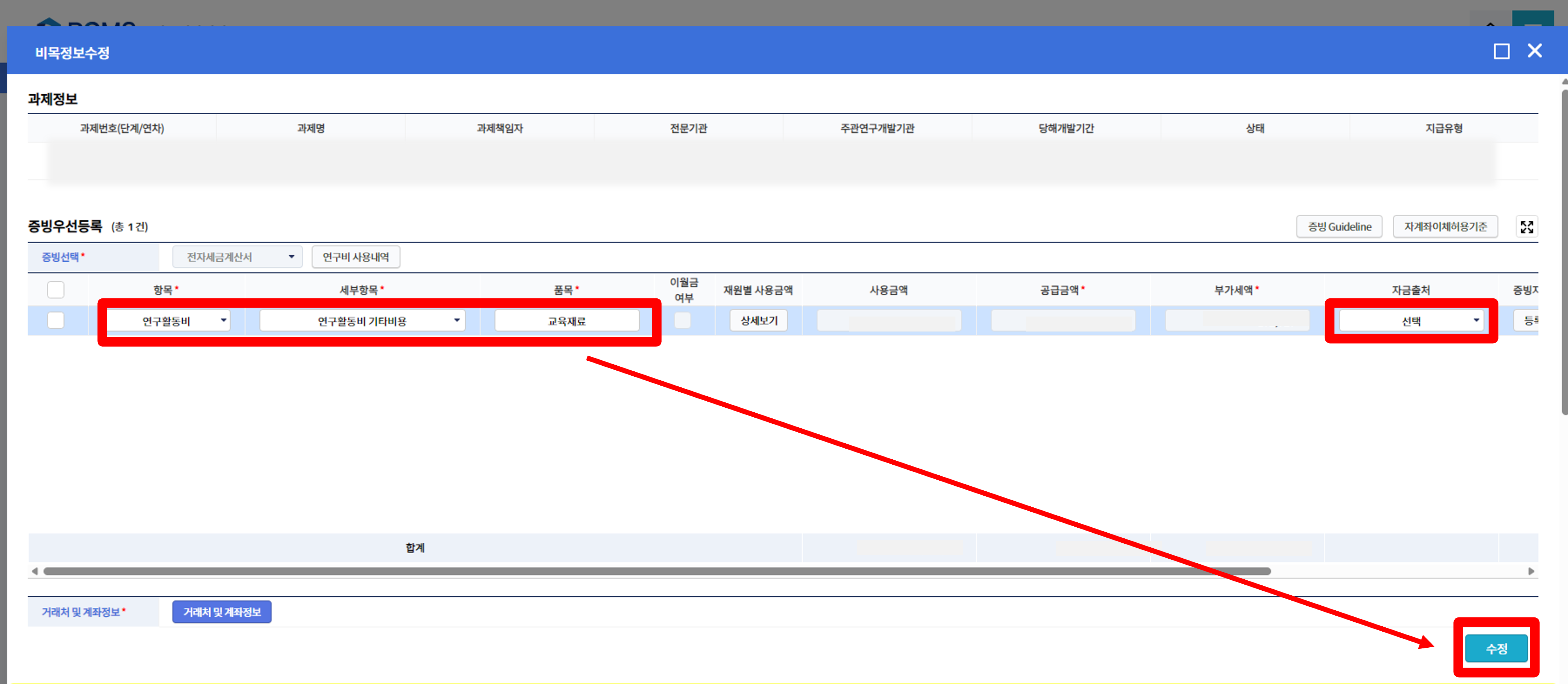 항목, 세부항목, 품목 등 흰색 부분을 수정 후 수정을 클릭합니다. 비활성화된 부분은 수정이 불가합니다.