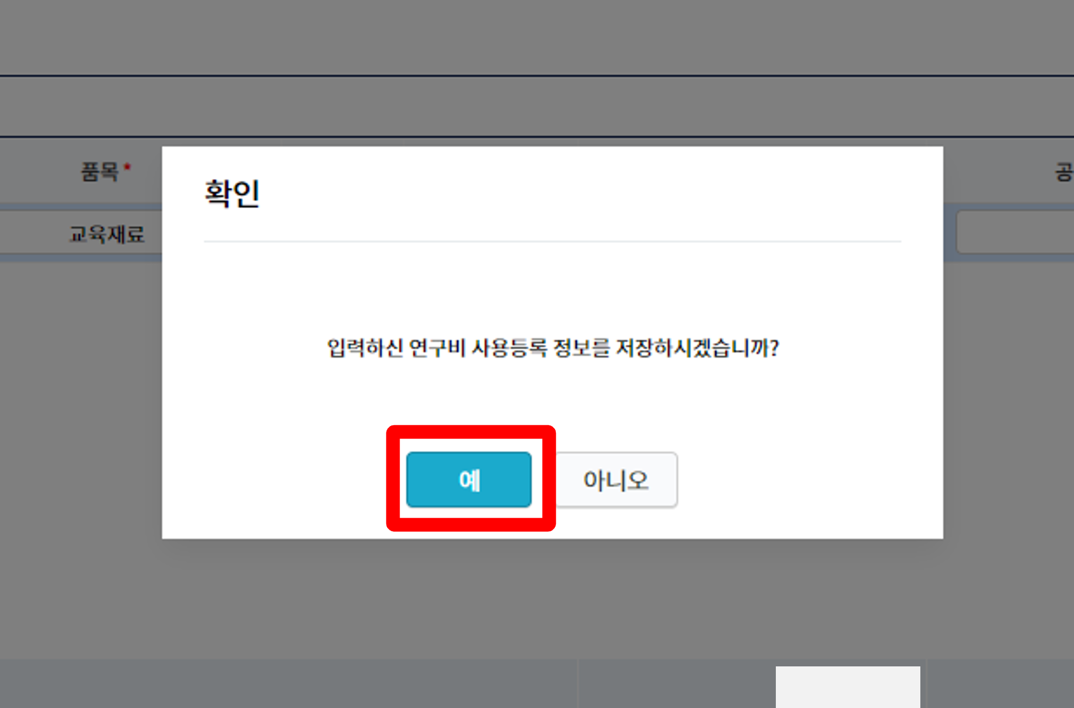 "입력하신 연구비 사용등록 정보를 저장하시겠습니까?"라는 메시지가 나오면 "예"를 클릭합니다.