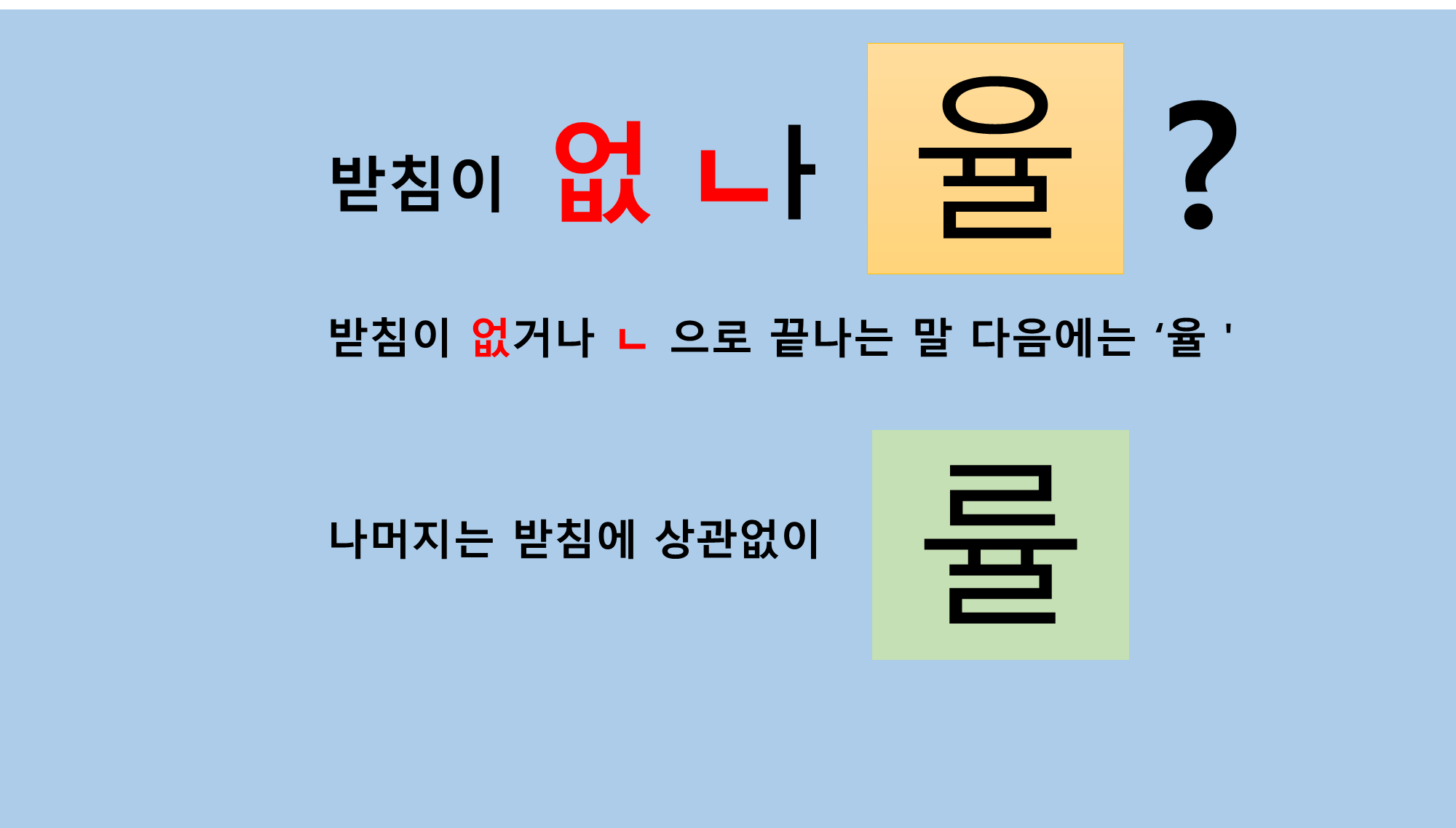 예시를 들어봤습니다. 받침이 없거나 'ㄴ'으로 끝나면 모두 '율'을 붙여줍니다.