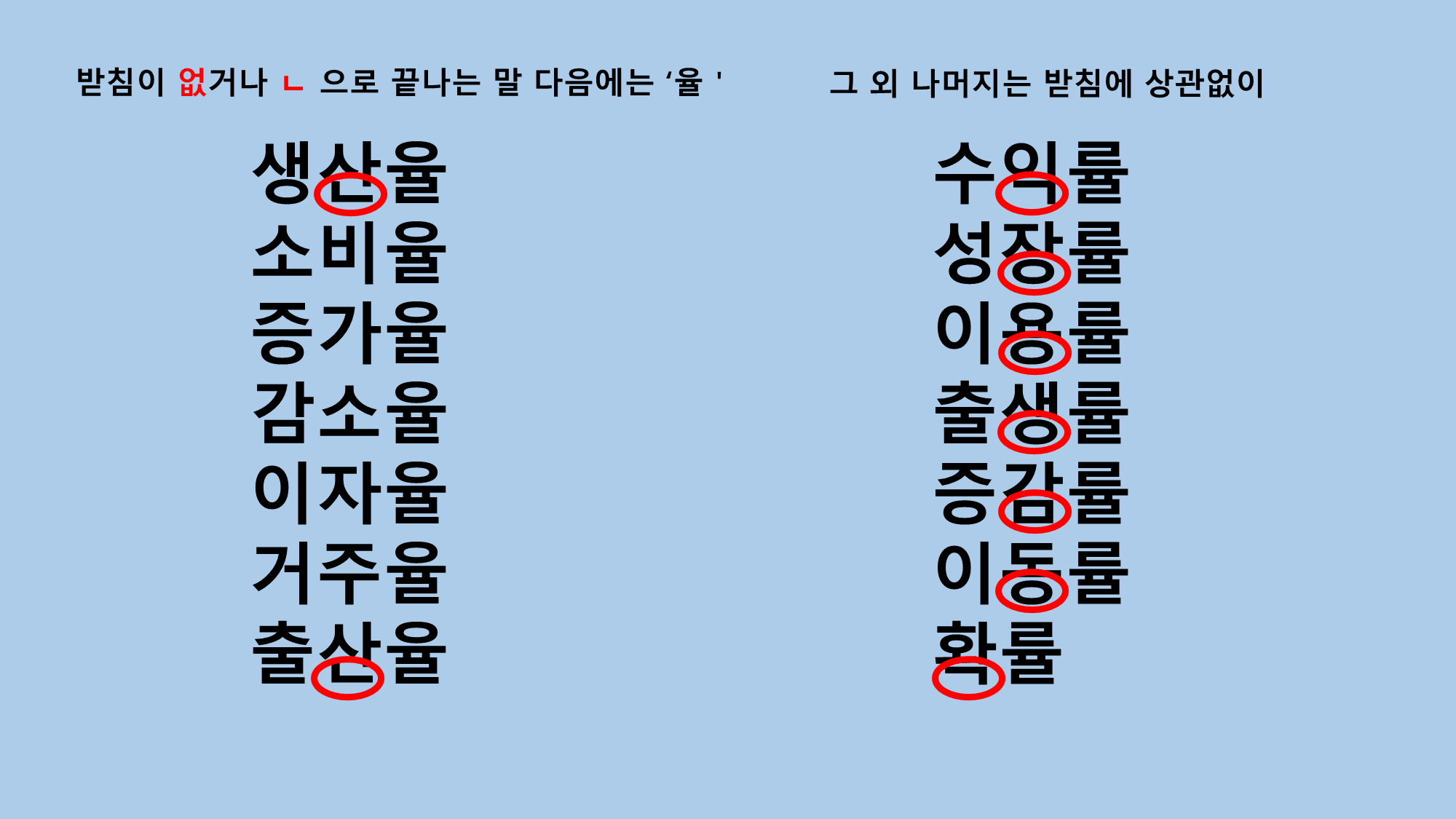 안녕하세요! 오늘은 받침에 '율'이 들어가야 할지 '률'이 들어가야 할지 항상 헷갈렸는데요, 그것을 한방에 정리해 보도록 하겠습니다.