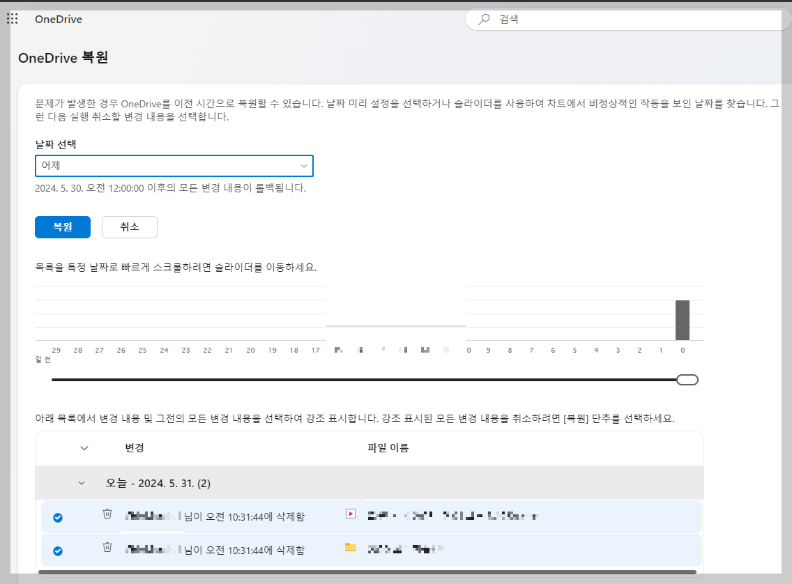 오늘 파일을 지웠으니 어제로 시점을 정해 복원을 누릅니다.