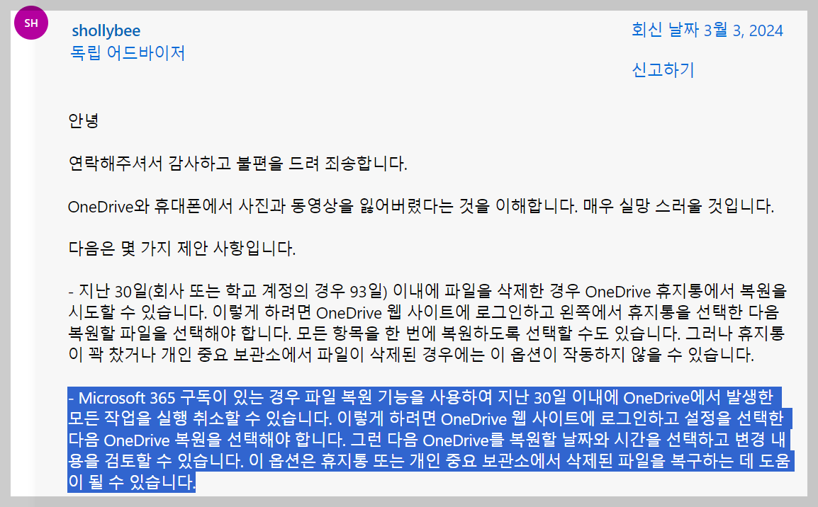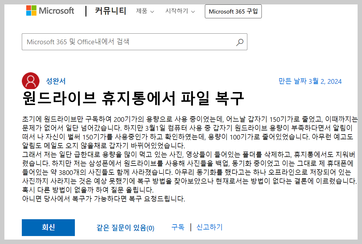 우선 제기된 문제는 원드라이브에서 제공하는 용량이 줄어들었고, 어쩌다 잘못해 파일을 삭제했는데, 이미 용량을 초과했기 때문에 복구를 못했다는 것입니다.