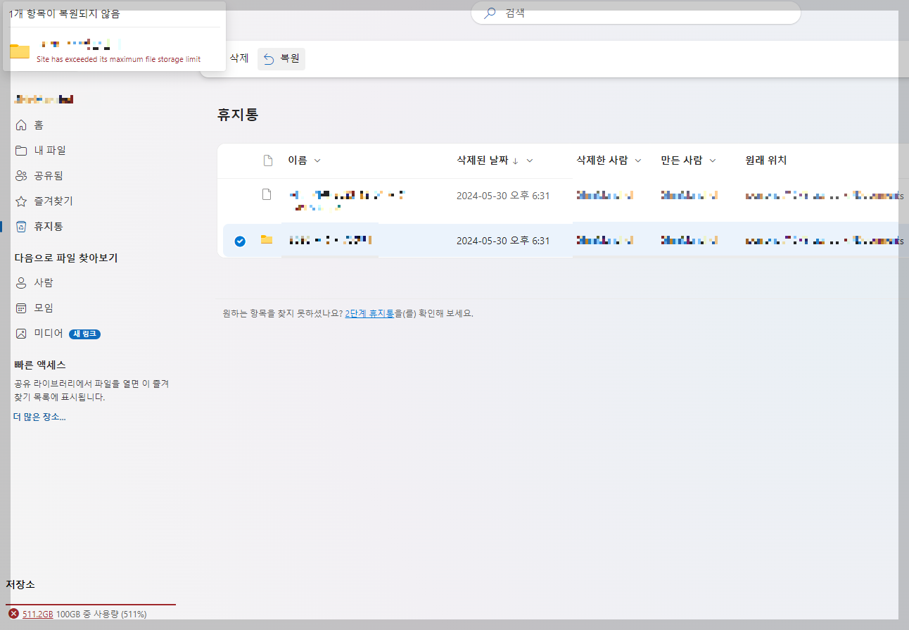 폴더에 딸린 메시지는 "Site has exceeded its maximum file storage limit"라고 하는데요, 용량을 초과했다는 얘기인 것 같습니다.