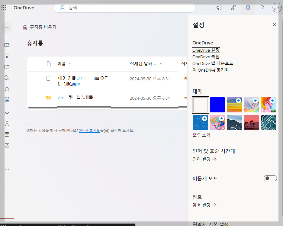휴지통 화면에서 우측 상단의 설정(톱니바퀴)을 누르고 원드라이브 복원을 누릅니다. 희망의 빛줄기가 보이고 있어요.