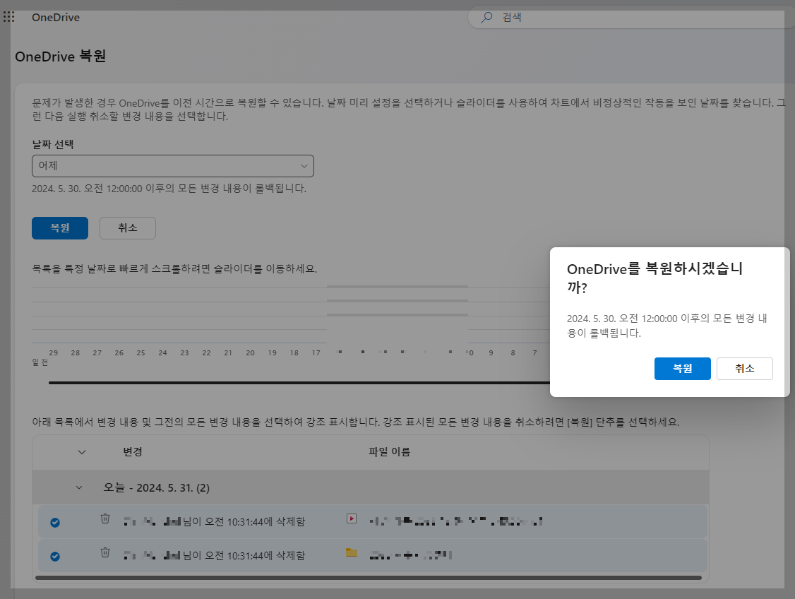 오늘 파일을 지웠으니 어제로 시점을 정해 복원을 누릅니다.