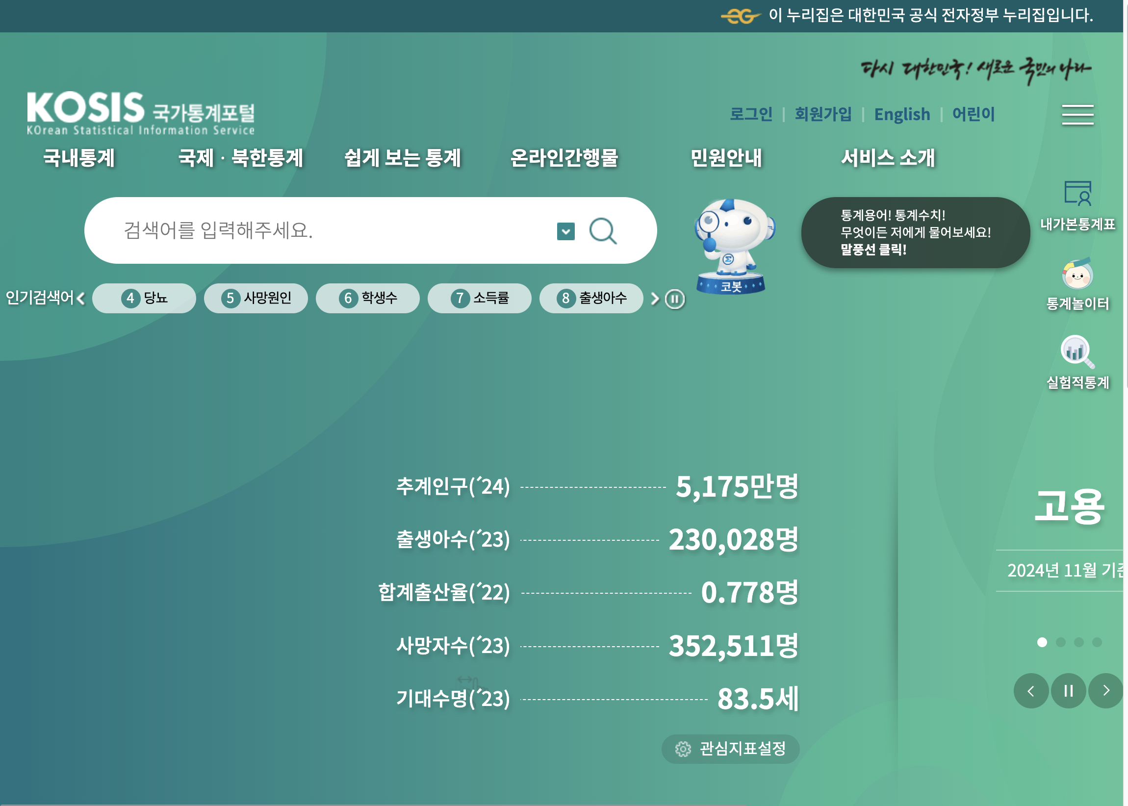 국가통계포털(KOSIS, Korean Statistical Information Service)은 국내·국제·북한의 주요 통계를 한 곳에 모아 이용자가 원하는 통계를 한 번에 찾을 수 있도록 통계청이 제공하는 One-Stop 통계 서비스입니다. 현재 300여 개 기관이 작성하는 경제·사회·환경에 관한 1,000여 종의 국가승인통계를 수록하고 있으며, 국제금융·경제에 관한 IMF, Worldbank, OECD 등의 최신 통계도 제공하고 있습니다. 쉽고 편리한 검색기능, 일반인들도 쉽게 이해할 수 있는 다양한 콘텐츠 및 통계설명자료 서비스를 통해 이용자가 원하는 통계자료를 쉽고 빠르고 정확하게 찾아보실 수 있습니다.