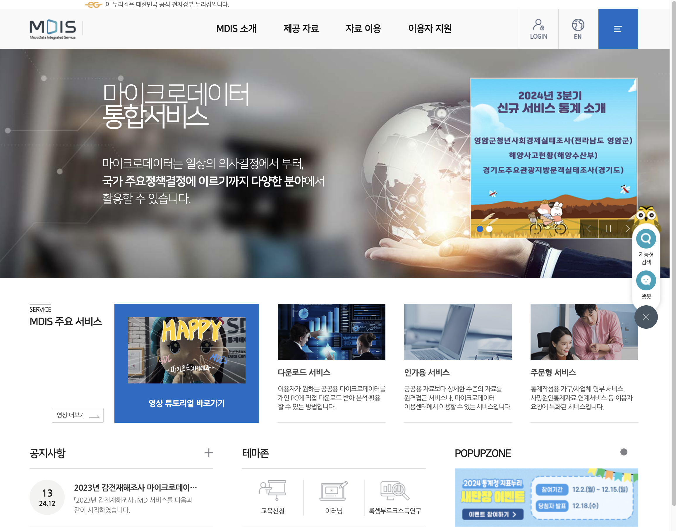 국가 주요정책 수립, 기업 경영전략 수립, 학술논문 등 심층 연구·분석에 활용되는 마이크로데이터의 수요가 지속해서 증가하고 있습니다. 이에 통계청은 자체 작성하는 마이크로데이터뿐만 아니라 정부 각 부처, 지자체, 연구기관 등 타 통계작성기관의 마이크로데이터를 한곳에 모아 MDIS (MicroData Integrated Service)를 통해 국민들이 다양한 통계자료를 편리하게 이용할 수 있도록 서비스하고 있습니다.