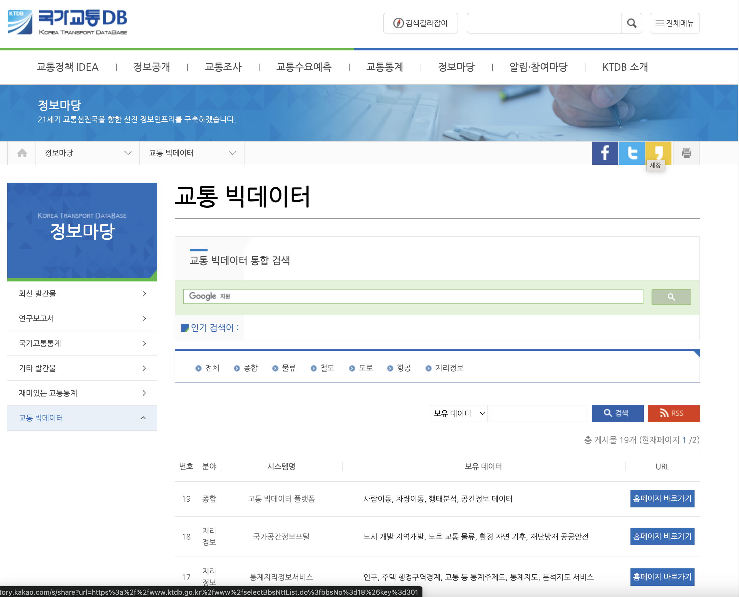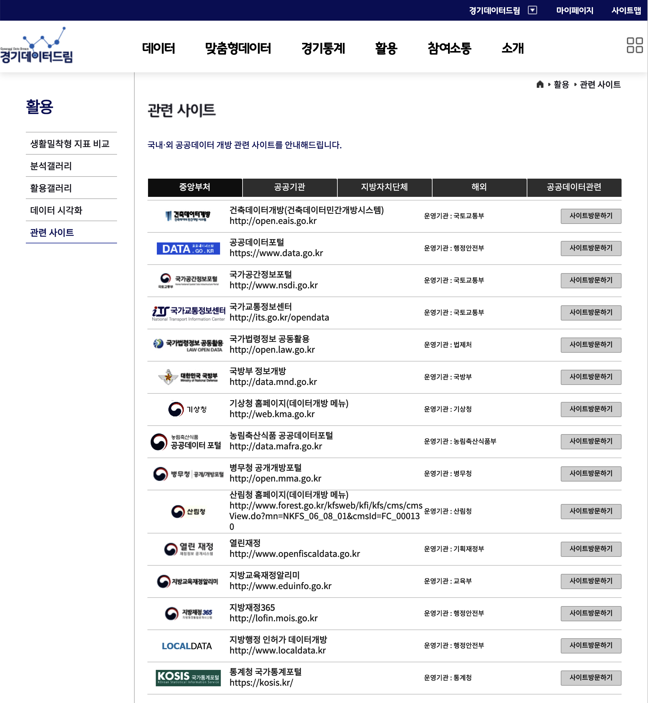 중앙부처, 공공기관, 지방자치단체 등 공공데이터에 접근할 수 있는 여러 기관들의 사이트를 간편하게 접속할 수 있도록 해놓았습니다.