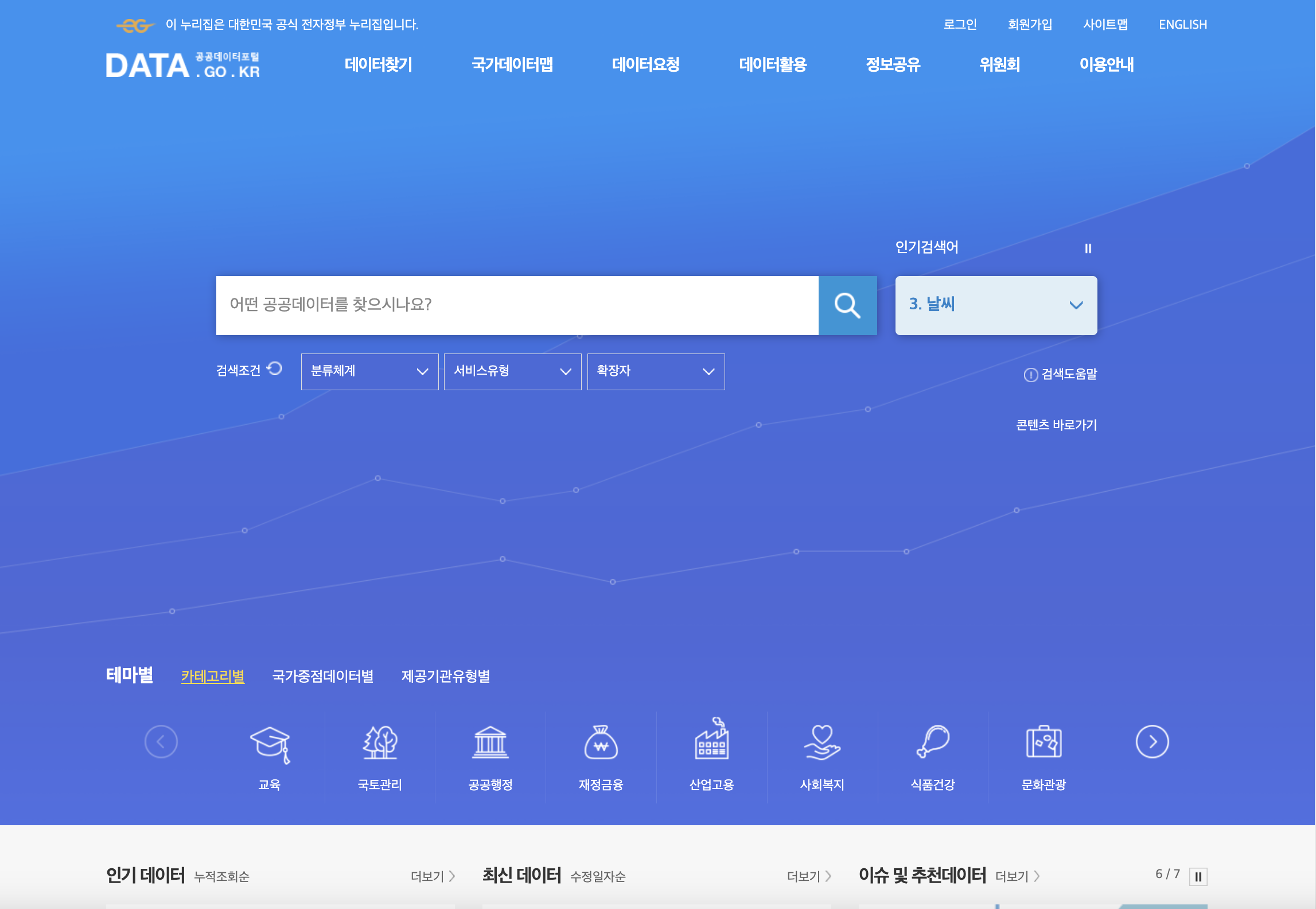 국가에서 보유하고 있는 다양한 데이터를『공공데이터의 제공 및 이용 활성화에 관한 법률(제11956호)』에 따라 개방하여 국민들이 보다 쉽고 용이하게 공유•활용할 수 있도록 공공데이터(Dataset)와 Open API로 제공하는 사이트입니다.
