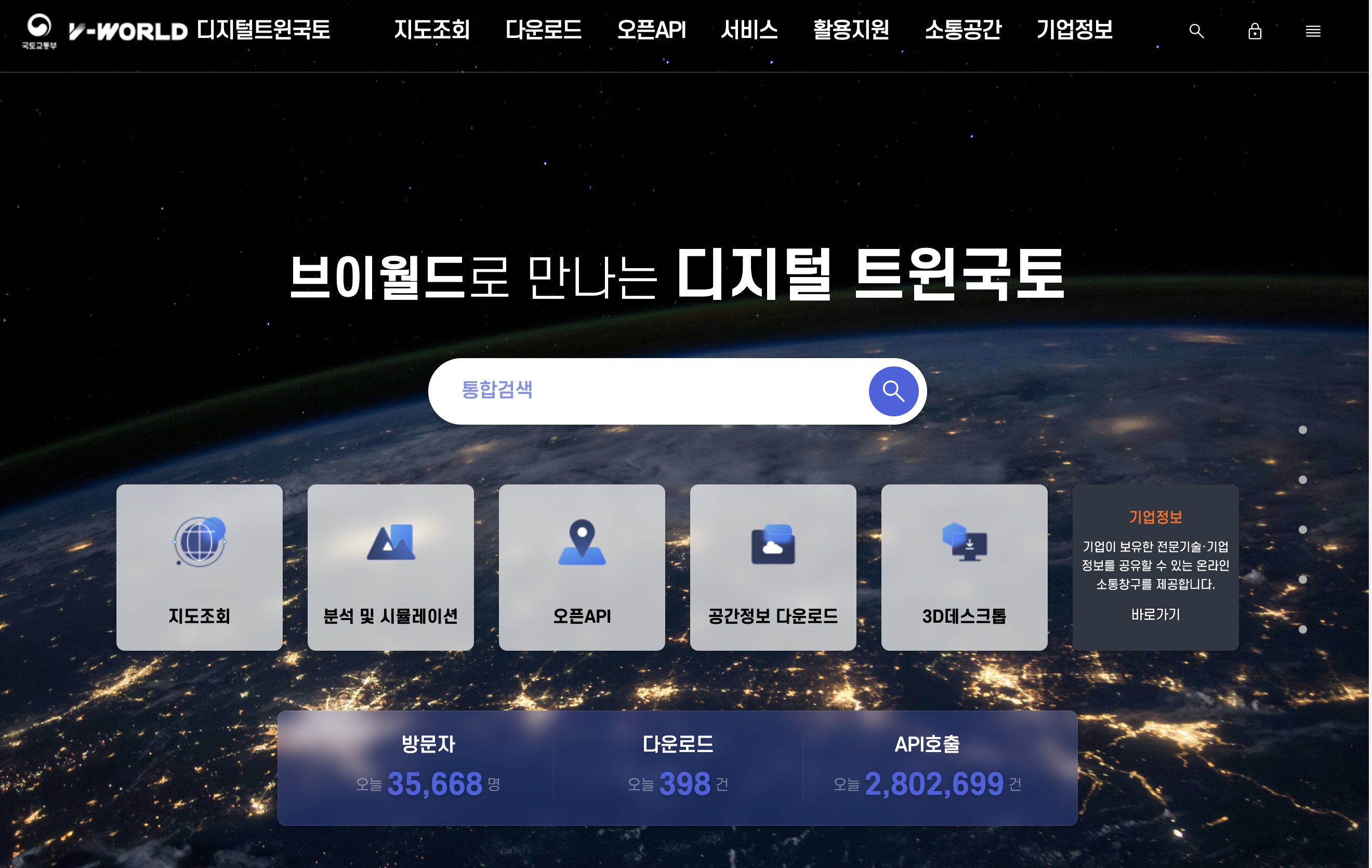 국가 공간정보의 개방, 공유, 참여를 통해 공간정보의 자율적이고 창조적인 다양한 애플리케이션을 개발할 수 있도록 기술과 서비스를 제공합니다.