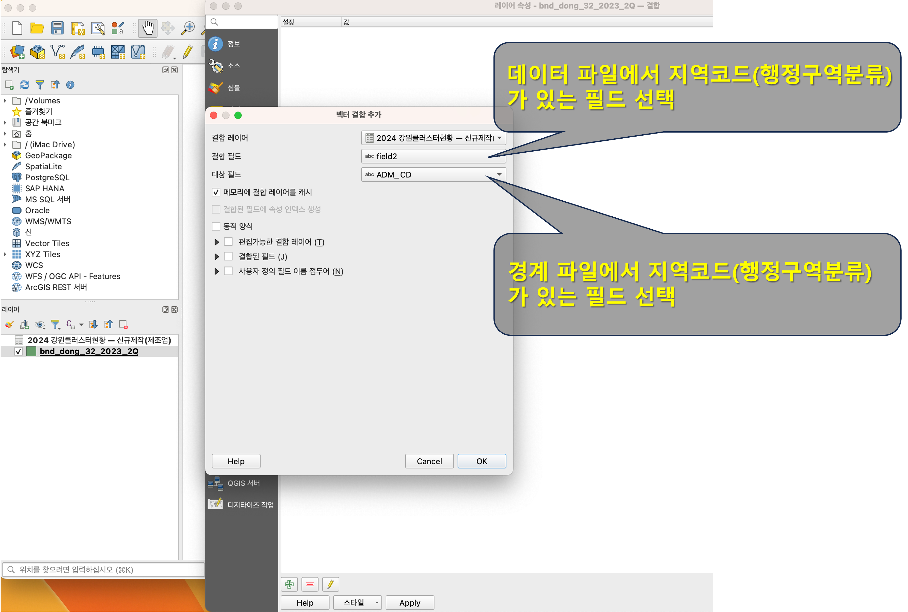 <벡터 결합 추가>라는 팝업창이 뜨는데요, 결합 필드는 데이터 파일에서 지역코드가 있는 필드를 선택하고, 대상 필드는 경계 파일(셰이프 파일)에서 지역코드가 있는 필드를 선택합니다. 나머지는 그대로 두셔도 됩니다.