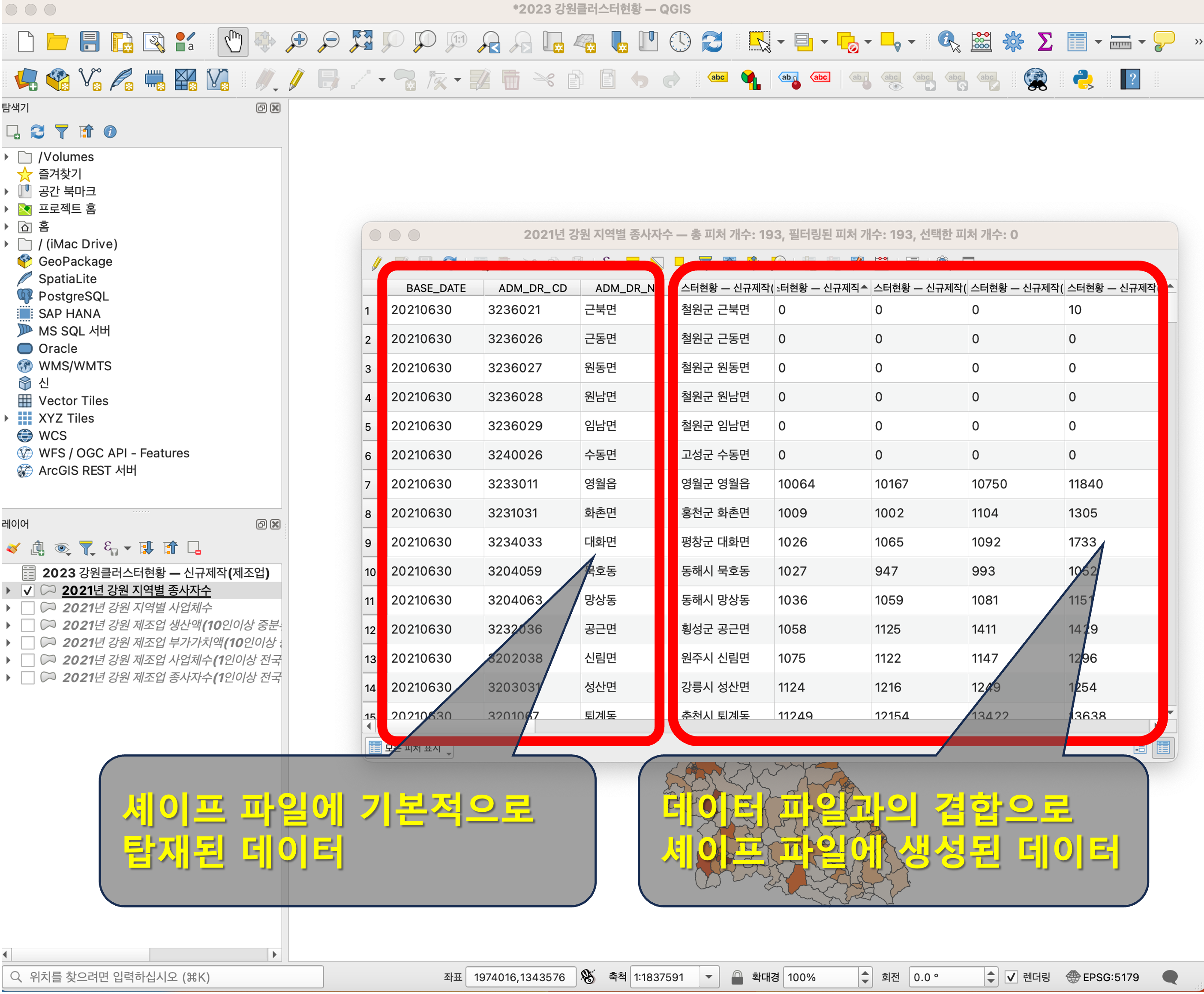 셰이프 파일을 살펴보니 제대로 결합이 되었습니다. 왼쪽은 셰이프 파일에 기본적으로 탑재된 데이터이고, 오른쪽은 데이터 파일과의 결합으로 원래 데이터 파일에 있던 값들이 셰이프 파일에 생성된 데이터입니다.
