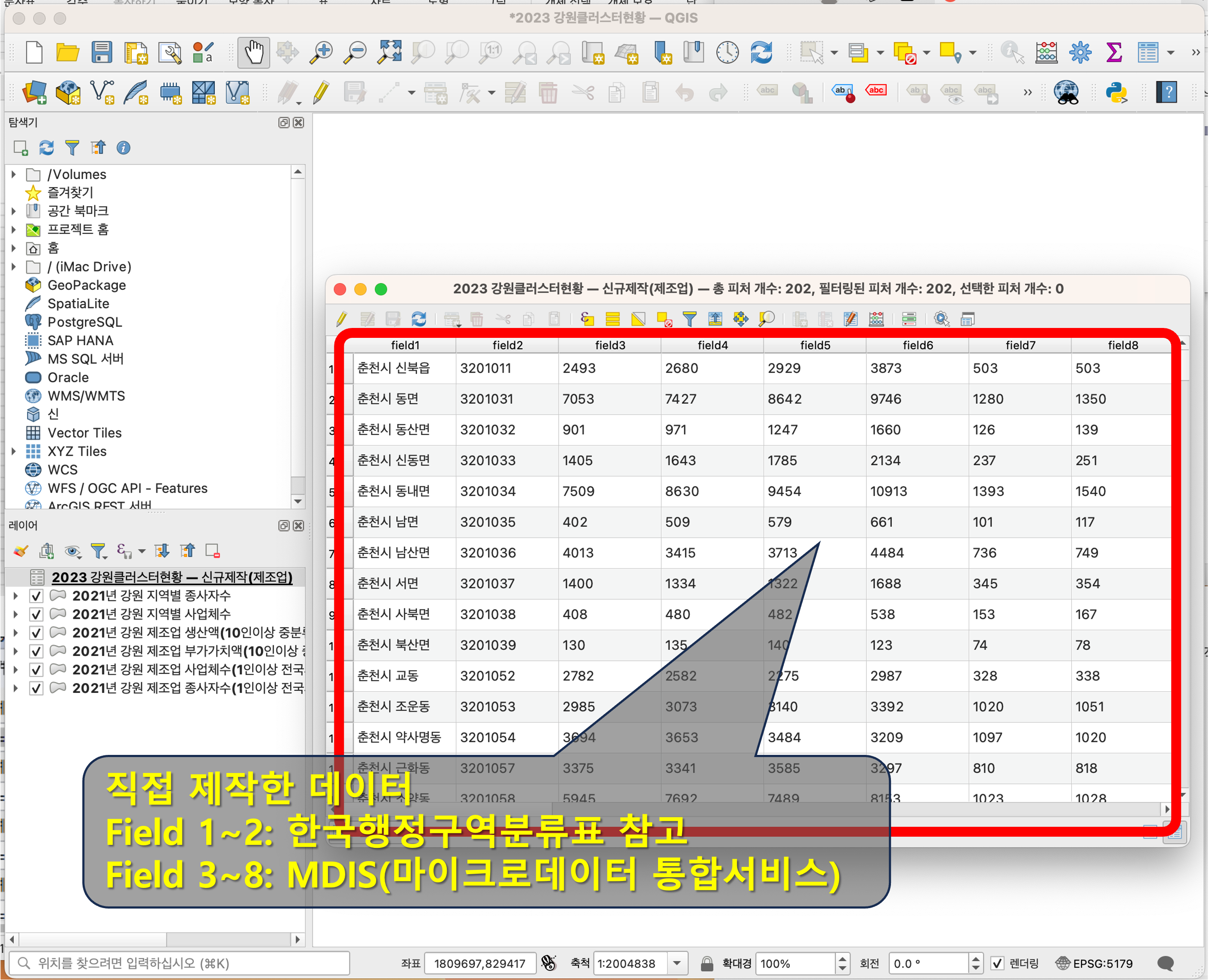 아래 보시는 데이터는 엑셀 파일로서, 필드1~2는 한국행정구역분류표를 참고하였고, 필드 3~8까지는 MDIS(마이크로데이터 통합서비스)에서 가져온 것들입니다.