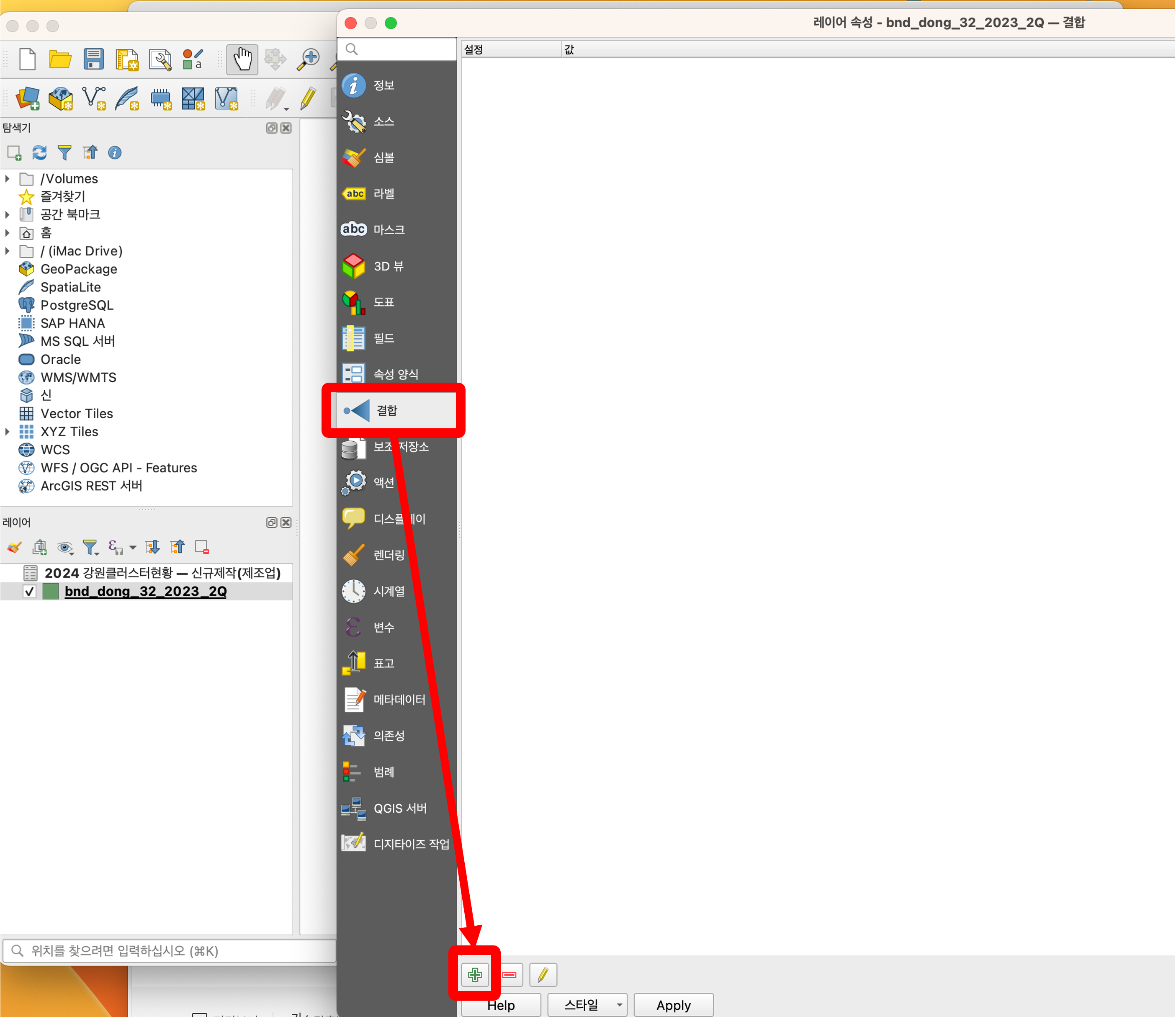 메뉴 중에 결합이 있습니다. 결합을 클릭하고 밑에 더하기 표시를 클릭합니다.