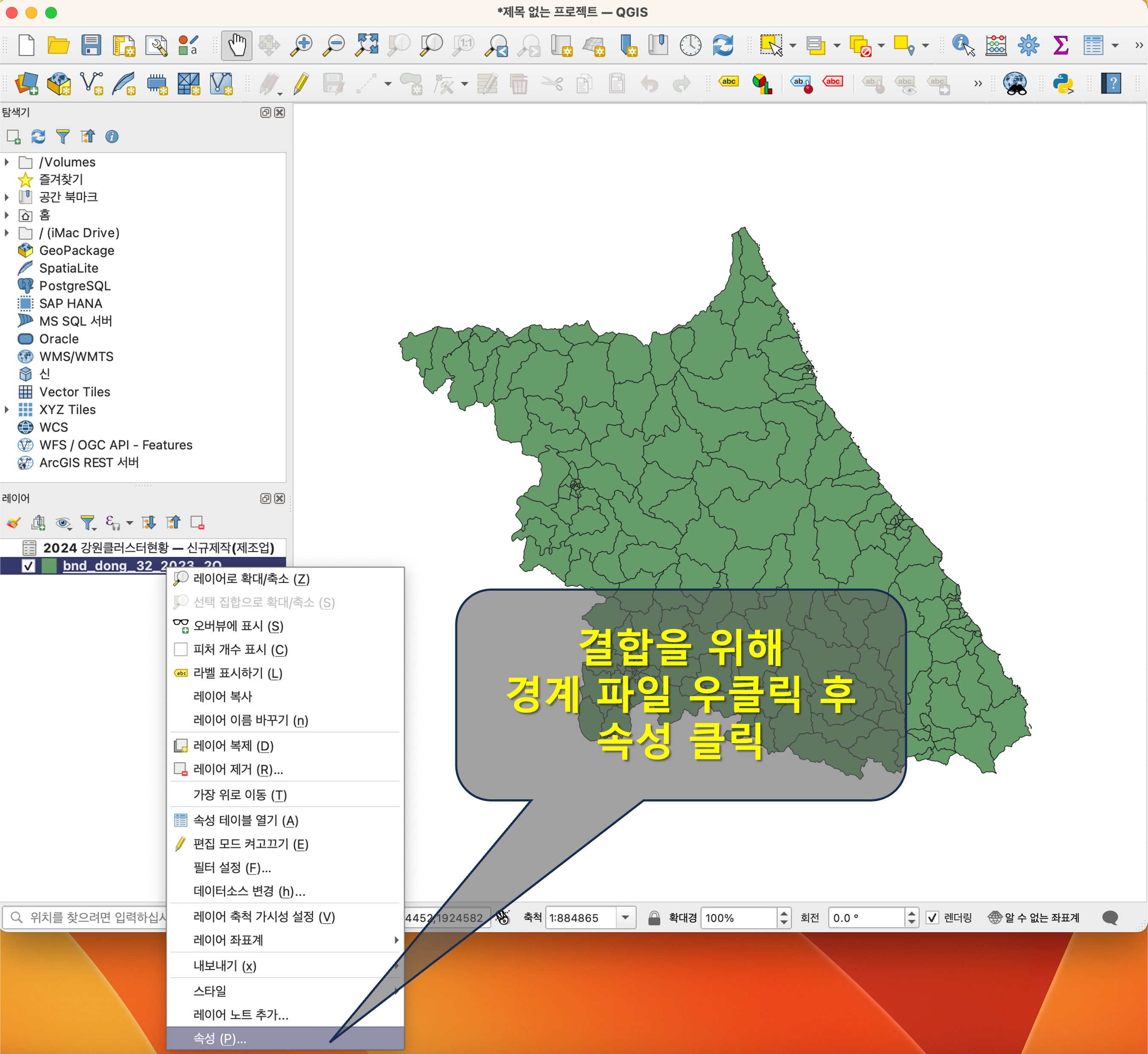 이제 셰이프 파일과 데이터 파일을 결합하기 위해 셰이프 파일이 선택된 상태에서 우클릭 한 후 속성을 클릭합니다. 셰이프 파일은 경계 파일이라고도 불립니다.