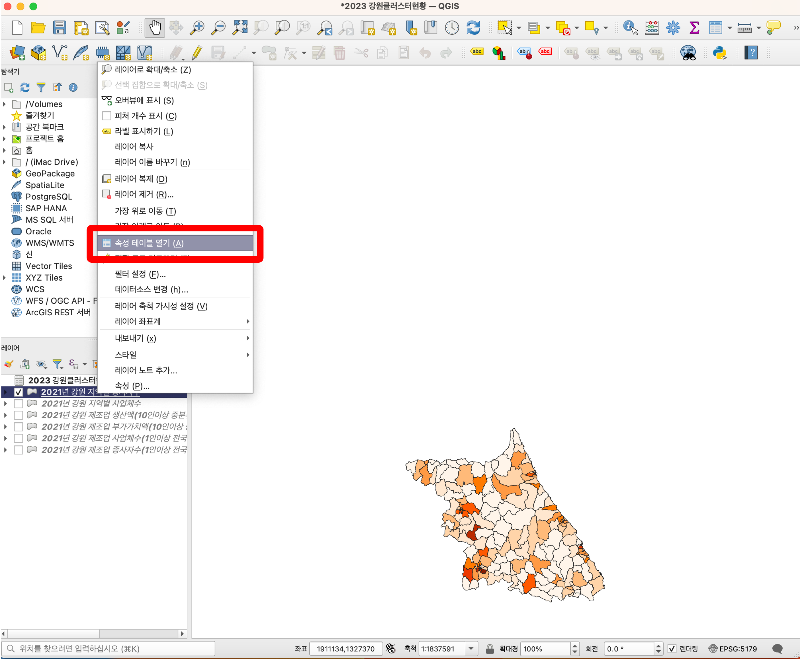 결합이 제대로 이뤄졌는지 확인하기 위해 셰이프 파일 선택 후 우클릭하여 <속성 테이블 열기>를 클릭합니다.