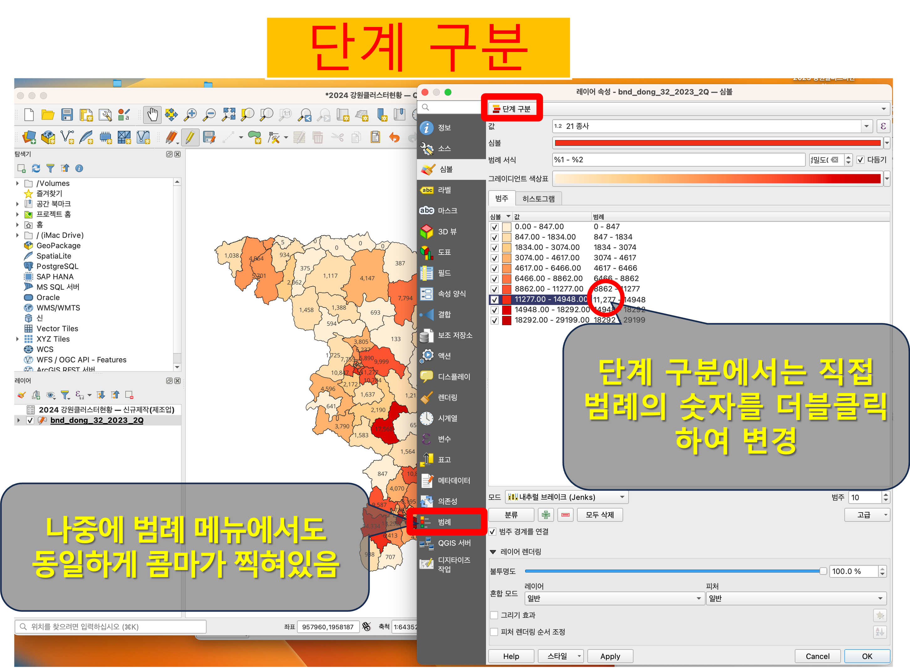 안녕하세요. 오늘은 QGIS로 만든 지도에서 범례에 천 자리 숫자 콤마를 집어넣는 방법에 관해 알아보겠습니다.