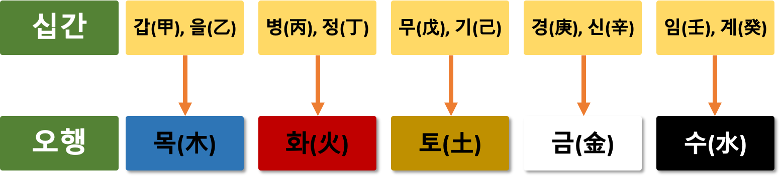 십간은 총 10개가 있는데요, 두 개씩 짝지어 그것과 매칭되는 오행이 있습니다. 그 오행에 따라서 색상이 결정되는 거지요.