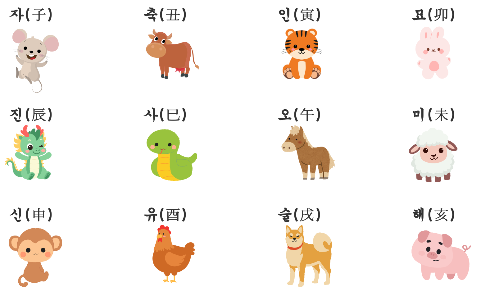 자(子), 축(丑), 인(寅), 묘(卯), 진(辰), 사(巳), 오(午), 미(未), 신(申), 유(酉), 술(戌), 해(亥)