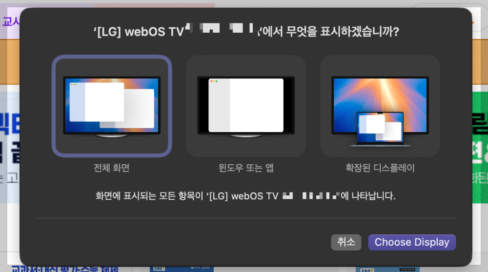아래 화면은 어떤 유형으로 미러링을 할지 물어보는 것입니다. 본인의 취향에 맞게 선택하면 됩니다. 선택 후 Choose Display를 선택합니다.