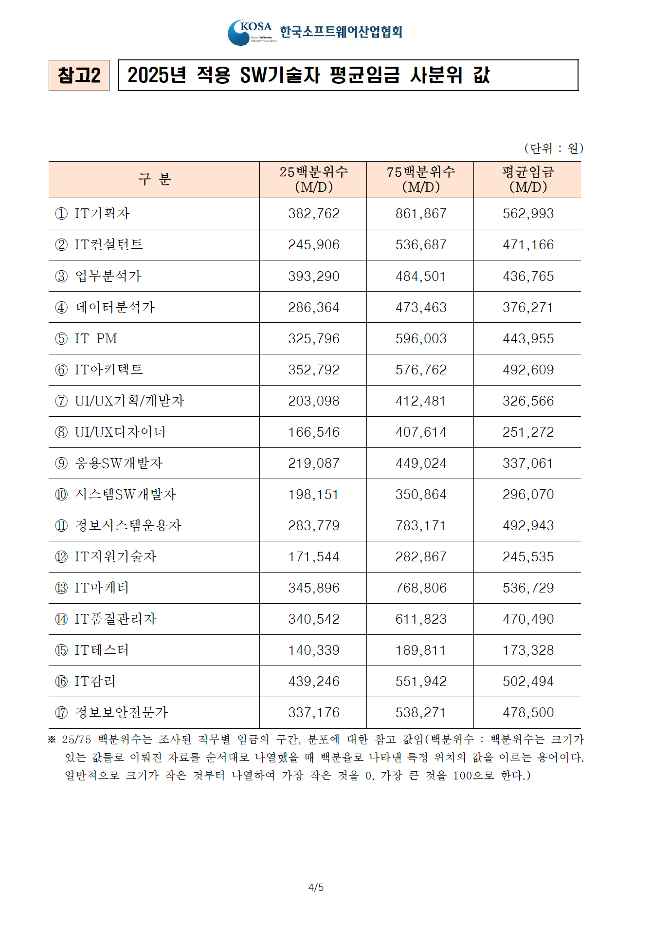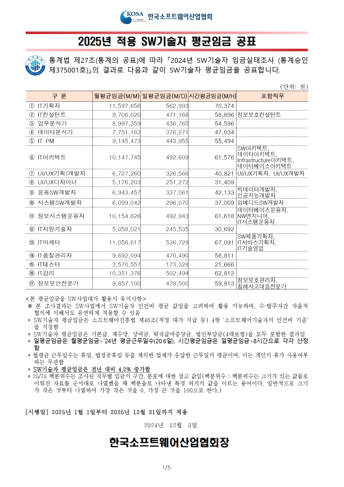 SW기술자 일평균임금 전년대비 4.2% 인상 한국SW산업협회 , 2025년 SW기술자 평균임금 공표 한국소프트웨어산업협회(회장 조준희, 이하 KOSA)는 직무기반의 2024년 소프트웨어(SW)기술자 임금실태조사