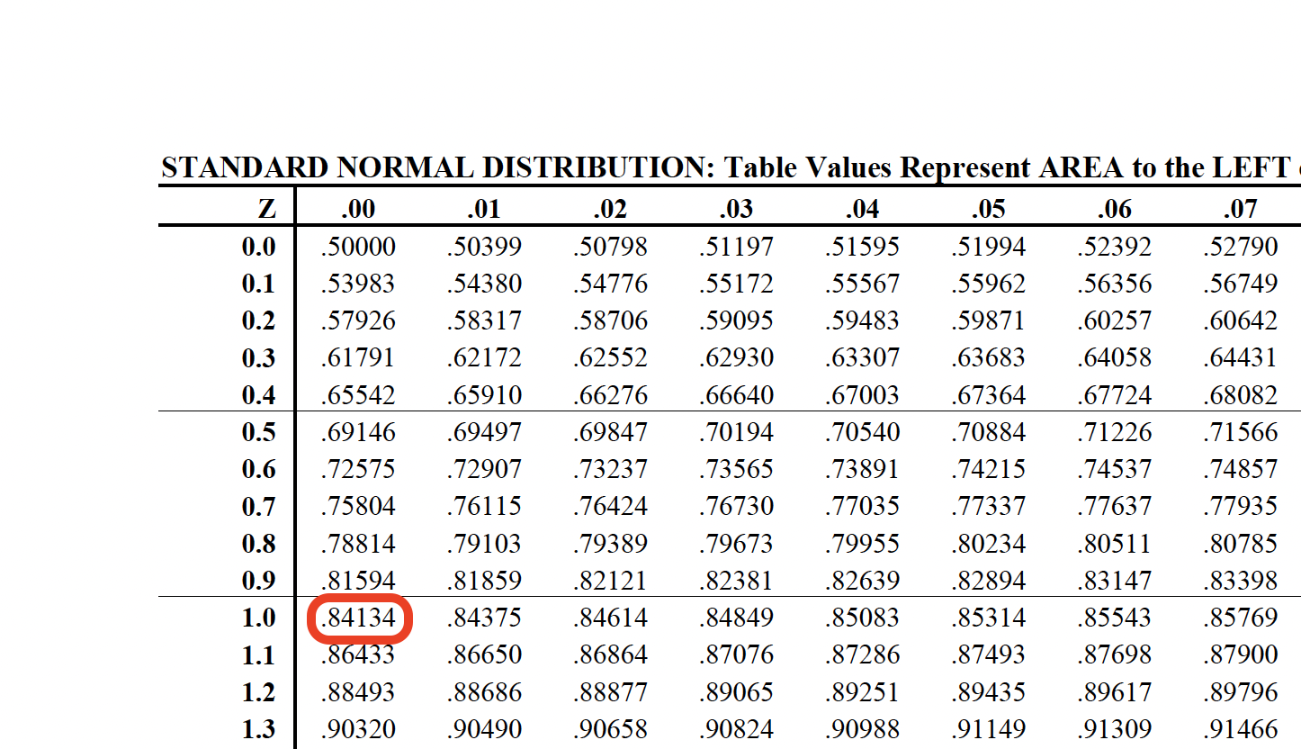 - 예를 들어, Z-점수 1.00에서 하위 84.13%를 알았으니, 상위 퍼센트는 1 - 0.8413 = 15.87%가 됩니다.
