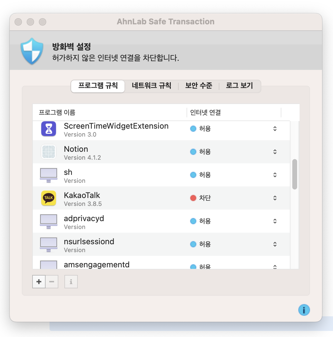 아래처럼 카카오톡이 차단되어 있을 겁니다. 이것이 허용으로 되어 있다면 안타깝지만 본 게시물은 도움을 드리지 못할 것 같습니다.