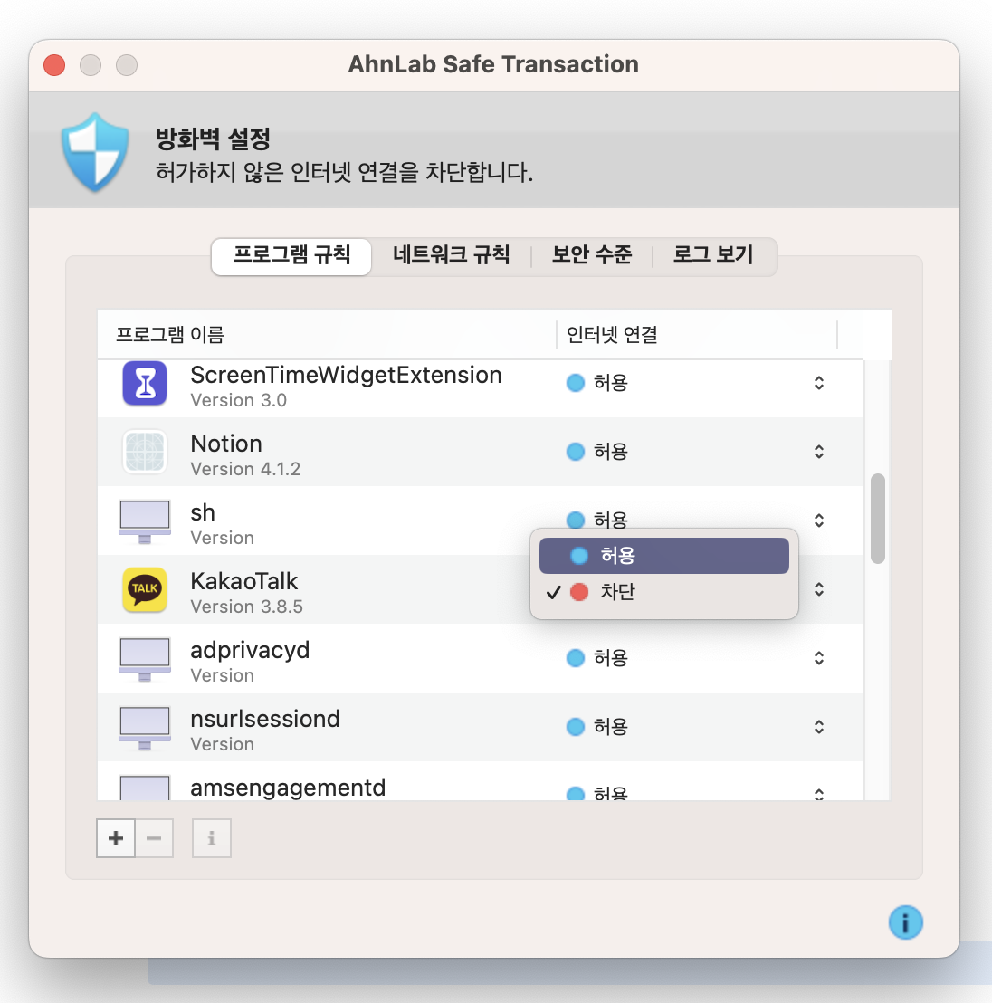 2. 방화벽 설정에서 카카오톡을 허용으로 변경하기
