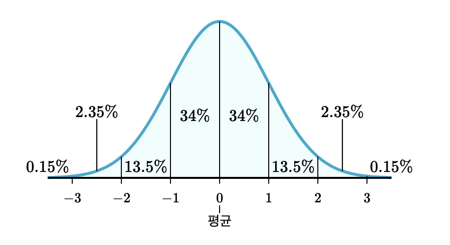 이 법칙은 정규분포에서 각 표준편차 범위 내에 포함되는 데이터의 비율을 설명해 주는데요, 표준정규분포의 법칙이라고도 합니다.